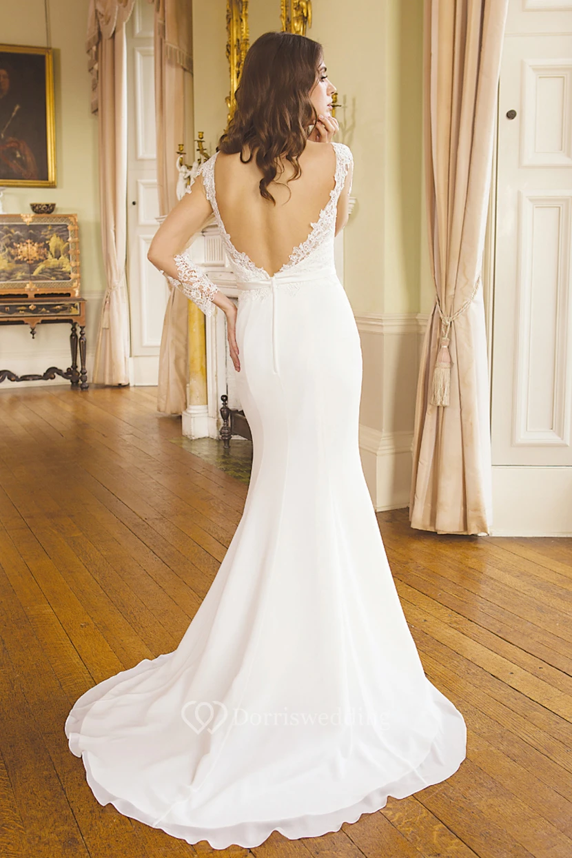 Mermaid Maxi V-Neck Illusion Sleeve Appliqued Chiffon Wedding Dress
