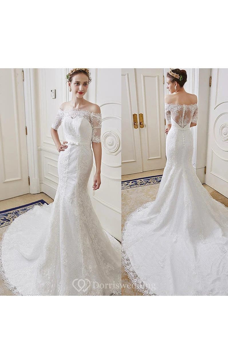 Mermaid Mini Scoop Bell Appliques Tiers Sweep Train Backless Button Keyhole Tulle Lace Dress