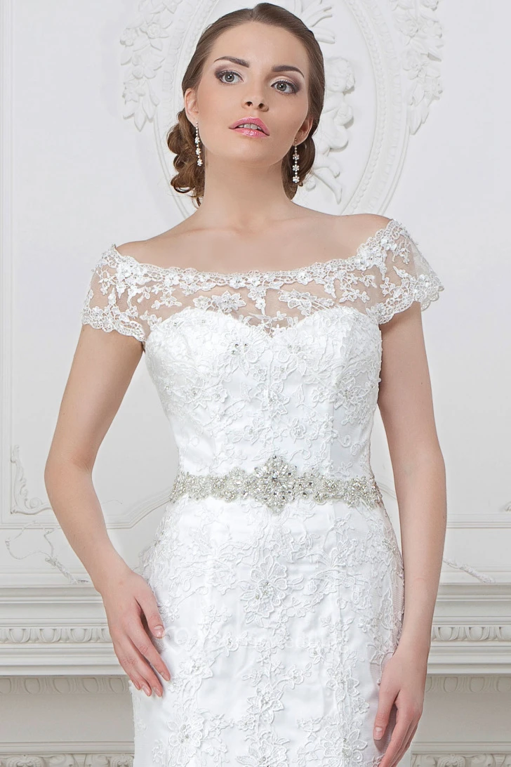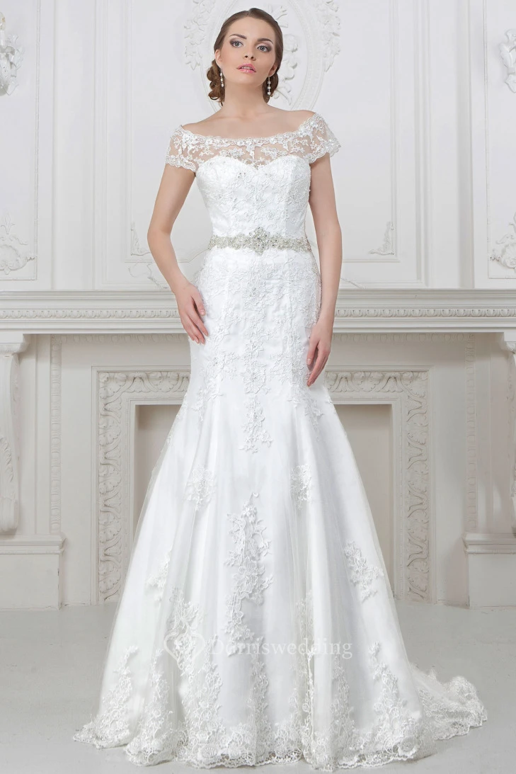 Mermaid Off-The-Shoulder Floor-Length Appliqued Lace Wedding Dress With Waist Jewellery
