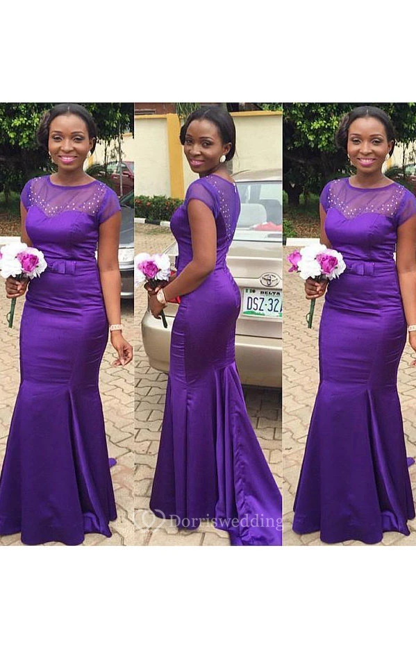 Mermaid Scoop Cap Bow Zipper Lace Satin Dress