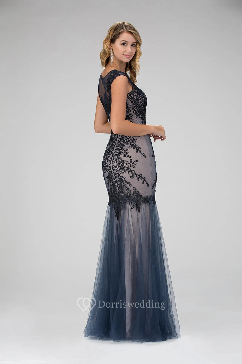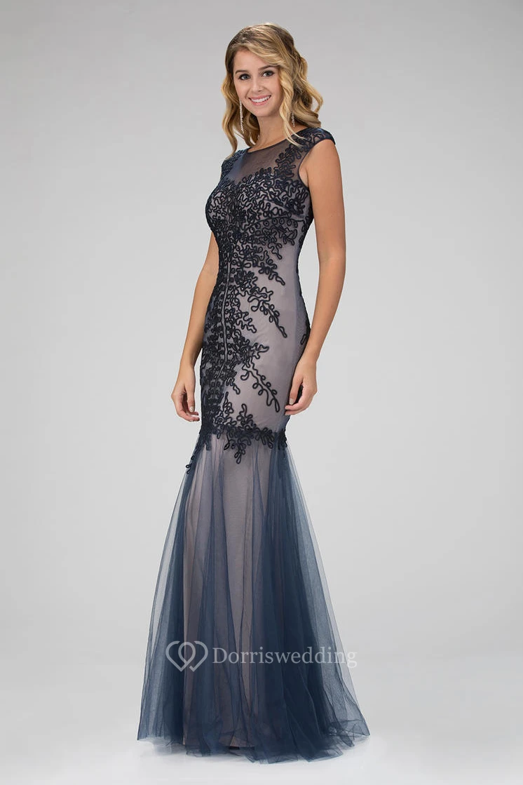 Mermaid Scoop-Neck Cap-Sleeve Tulle Illusion Dress With Embroidery