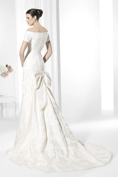 Mermaid Short-Sleeve V-Neck Appliqued Lace Wedding Dress With Bow
