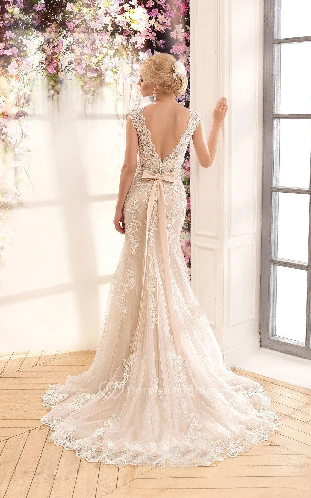 Mermaid Short Sleeveless Bell Cap Bat Beading Appliques Ribbon Brush Train Backless Lace Dress