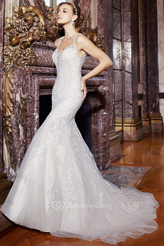 Mermaid Sleeveless Appliqued Maxi Strapless Lace Wedding Dress With Court Train And Keyhole Back
