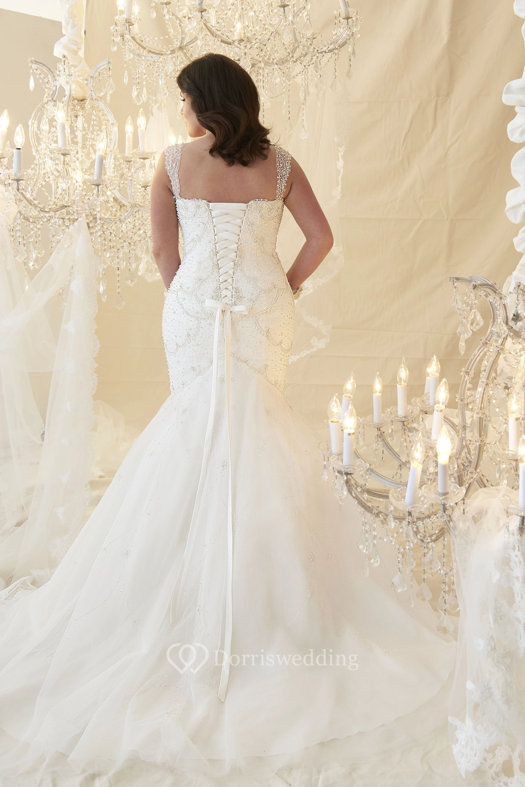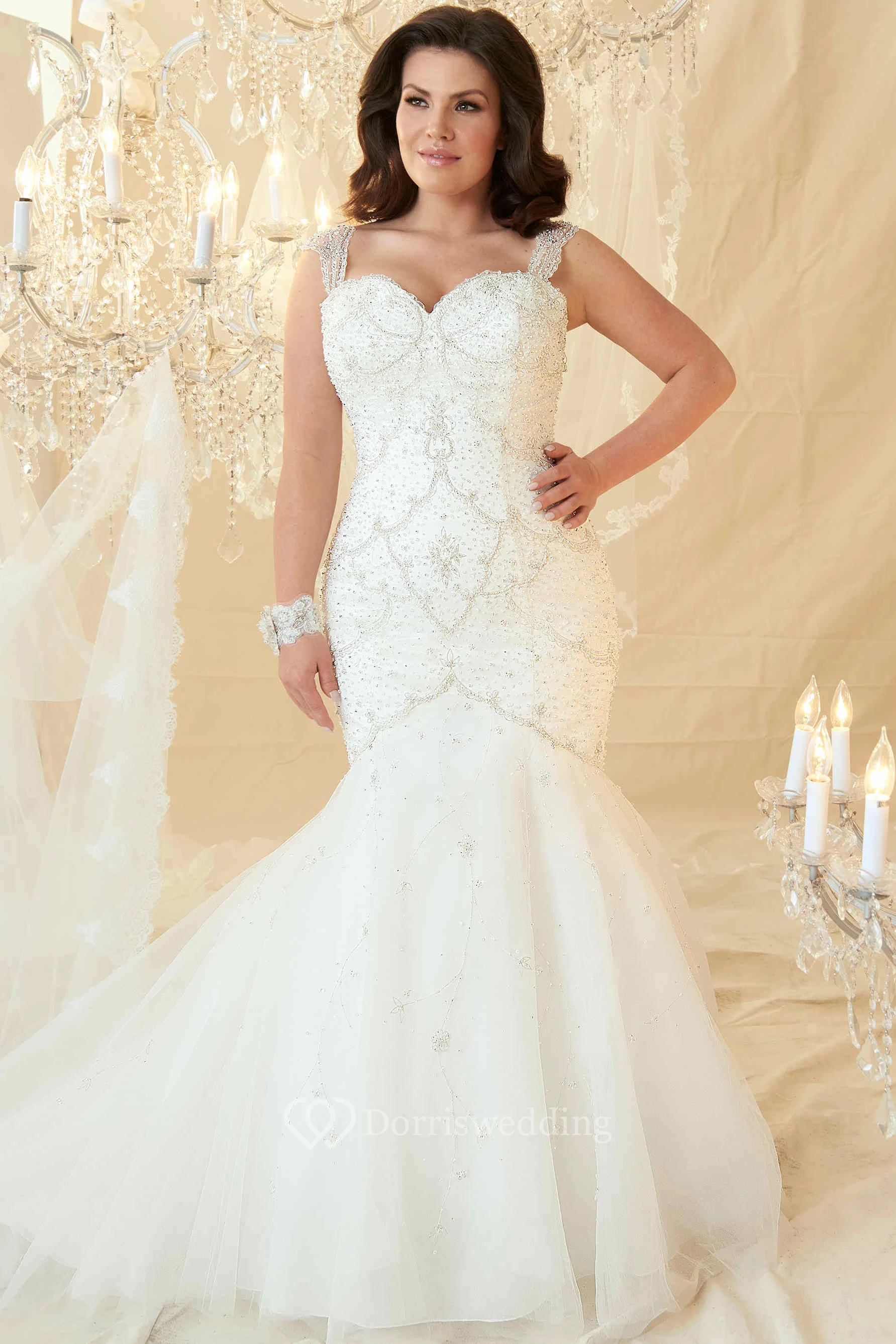 Mermaid Sleeveless Floor-Length Beaded Tulle Plus Size Wedding Dress