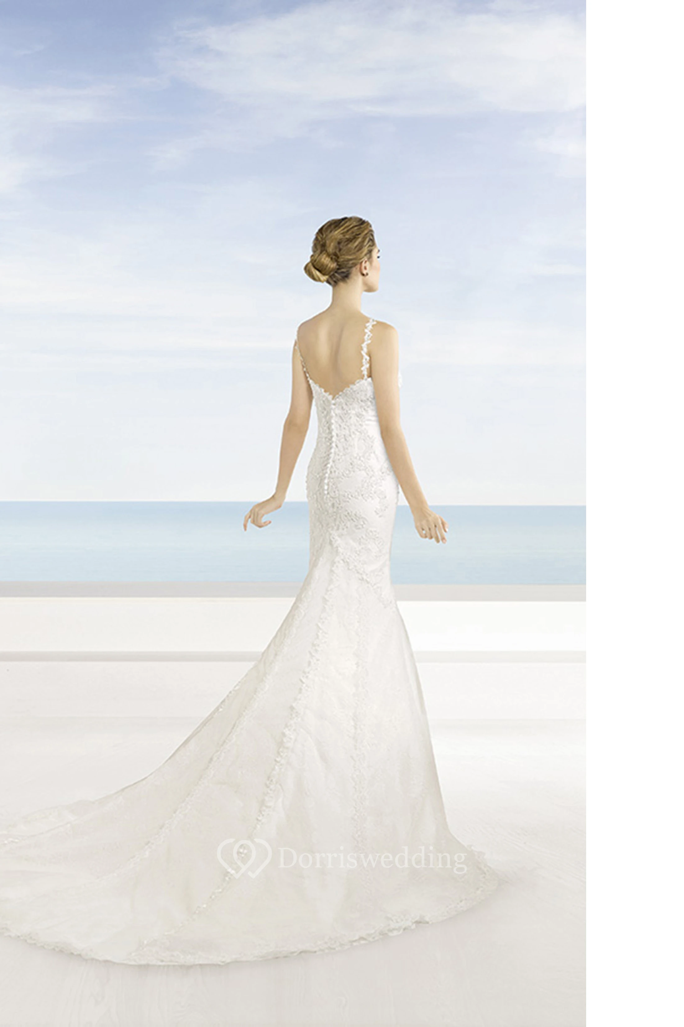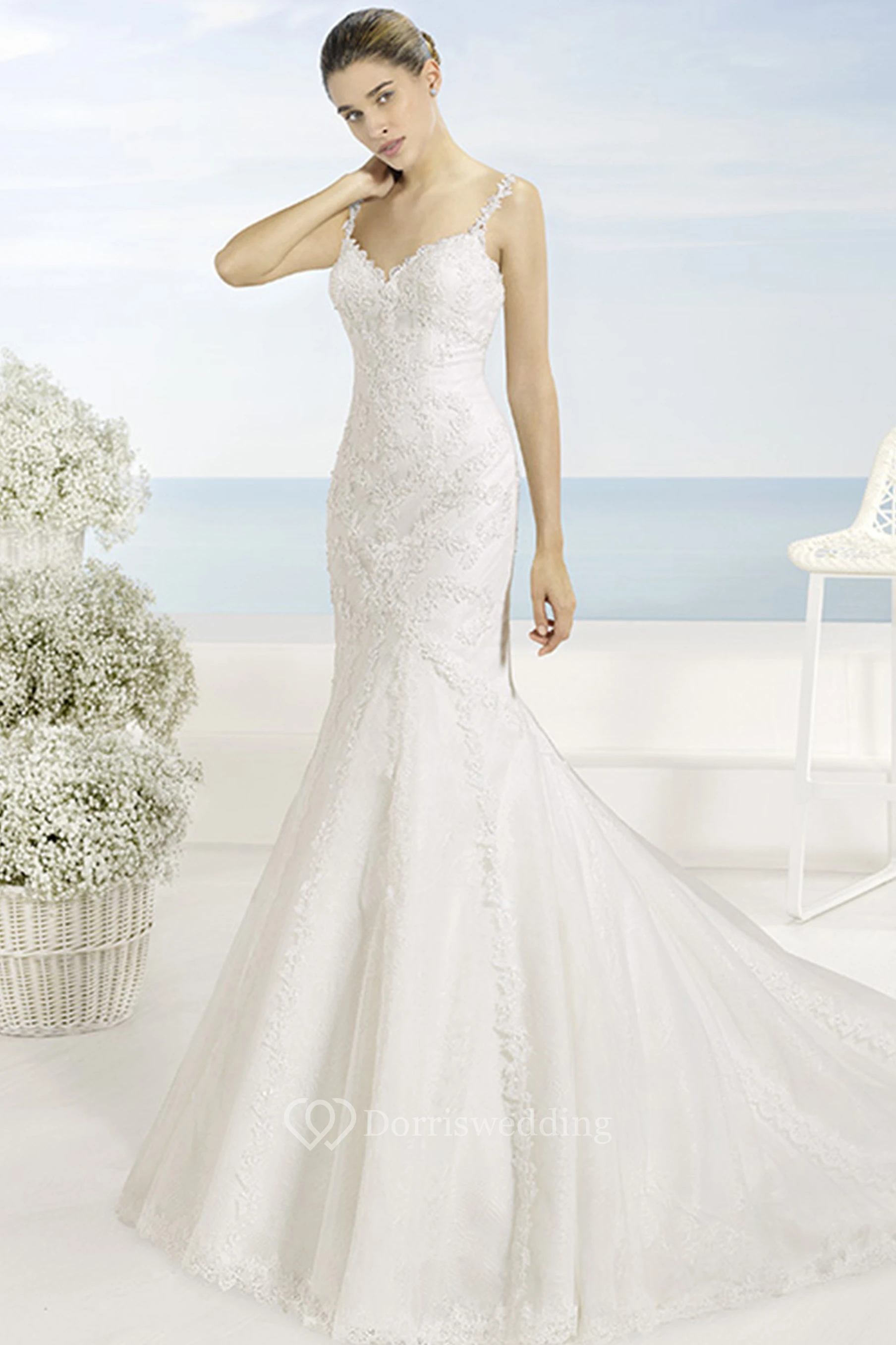 Mermaid Sleeveless Spaghetti Floor-Length Appliqued Lace Wedding Dress With Court Train And Low-V Back