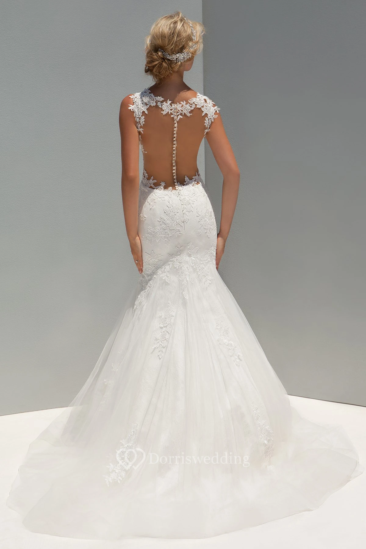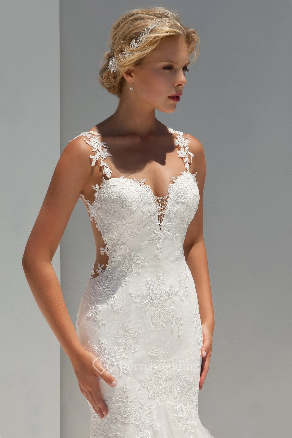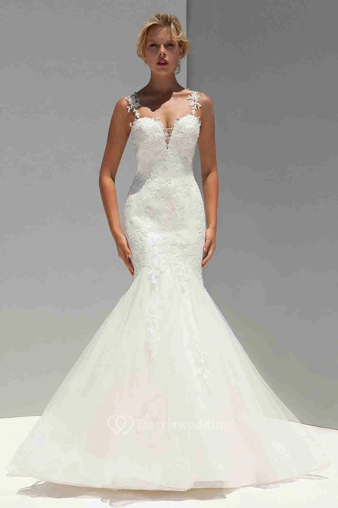 Mermaid Sleeveless Spaghetti Floor-Length Appliqued Tulle Wedding Dress