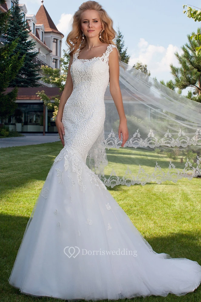 Mermaid Sleeveless Square Appliqued Floor-Length Lace&Tulle Wedding Dress With Illusion Back And Chapel Train