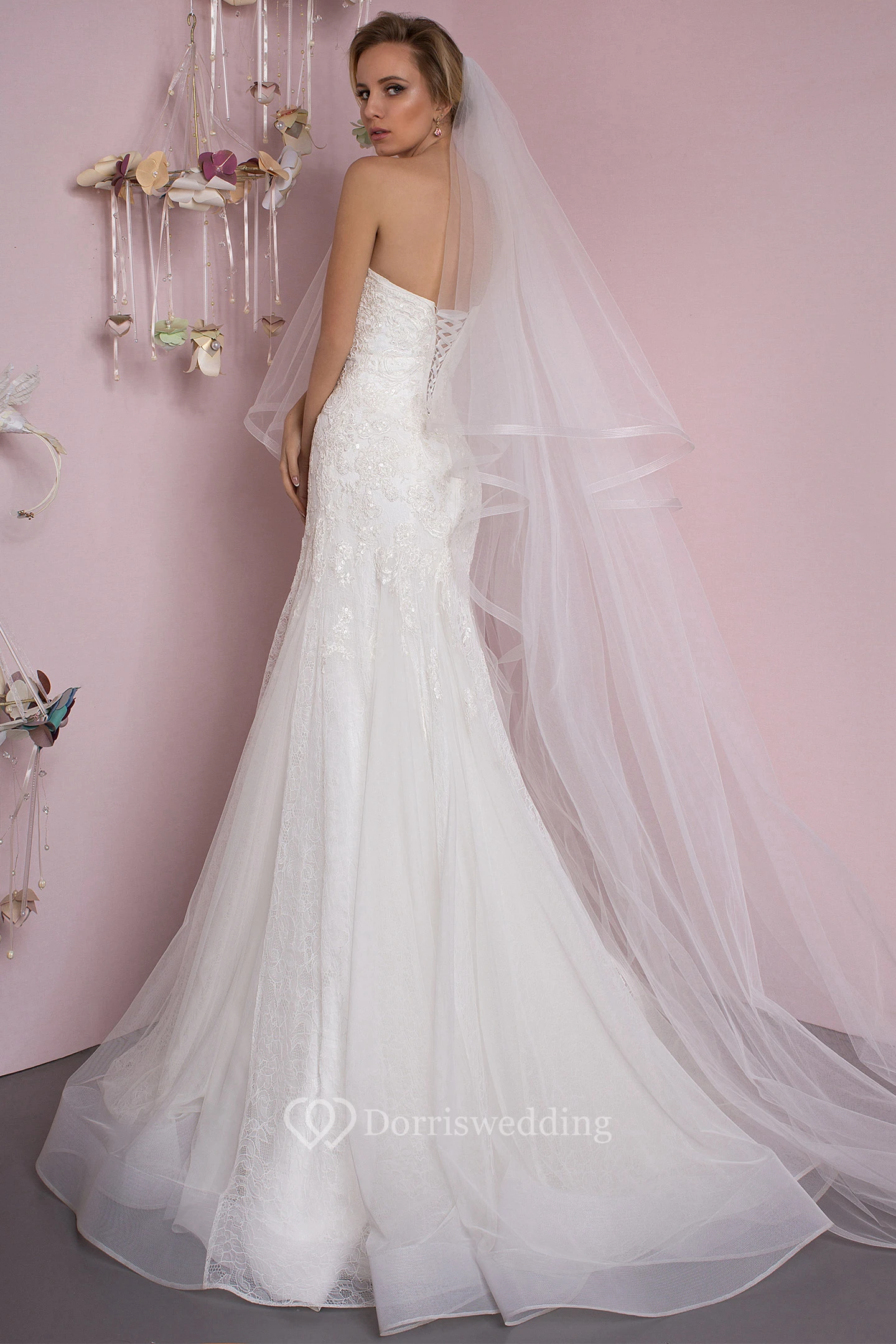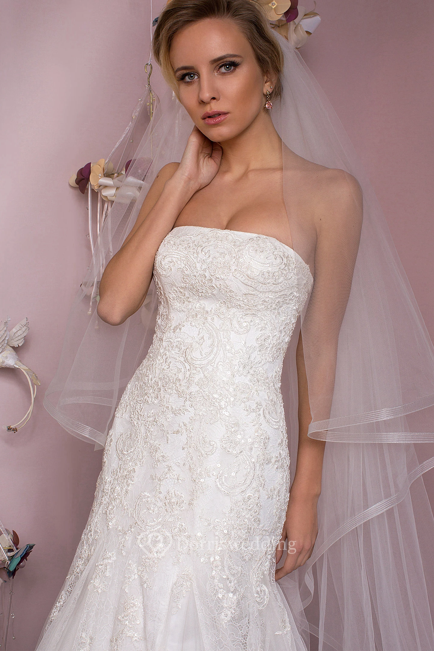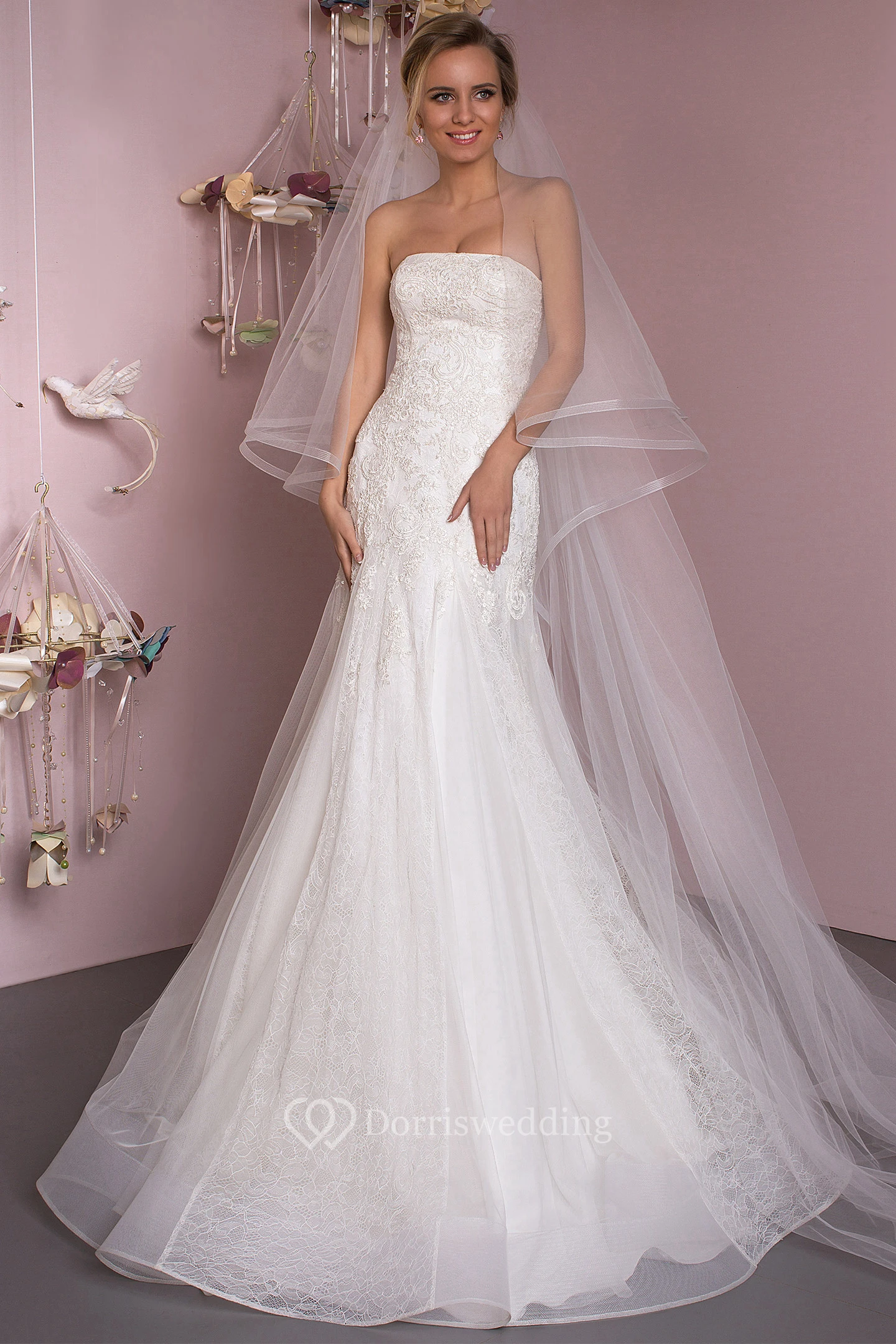 Mermaid Sleeveless Strapless Floor-Length Appliqued Lace&Tulle Wedding Dress With Lace-Up Back And Court Train