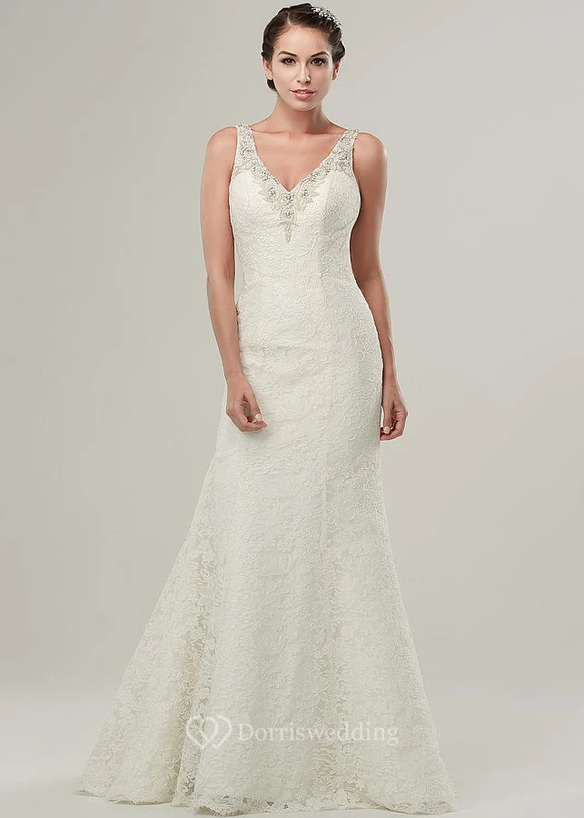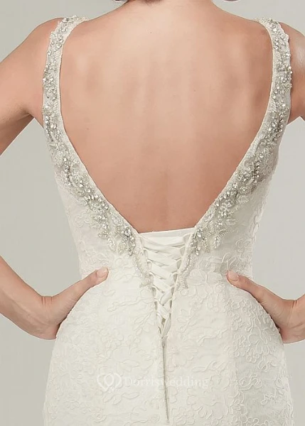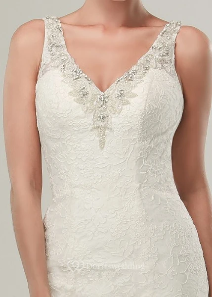 Mermaid Sleeveless V-Neck Appliqued Maxi Lace Wedding Dress With Beading