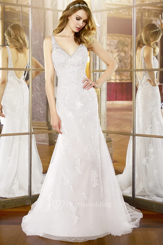 Mermaid Sleeveless V-Neck Floor-Length Appliqued Lace Wedding Dress With Court Train And Deep-V Back