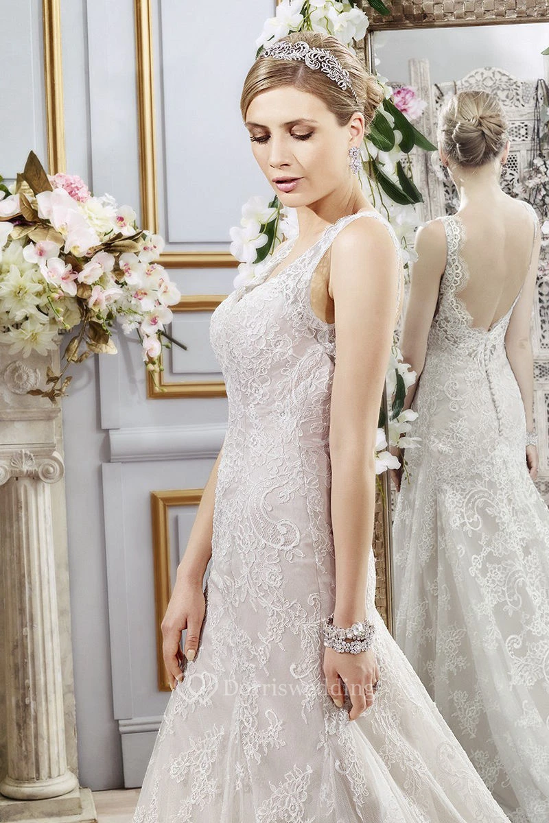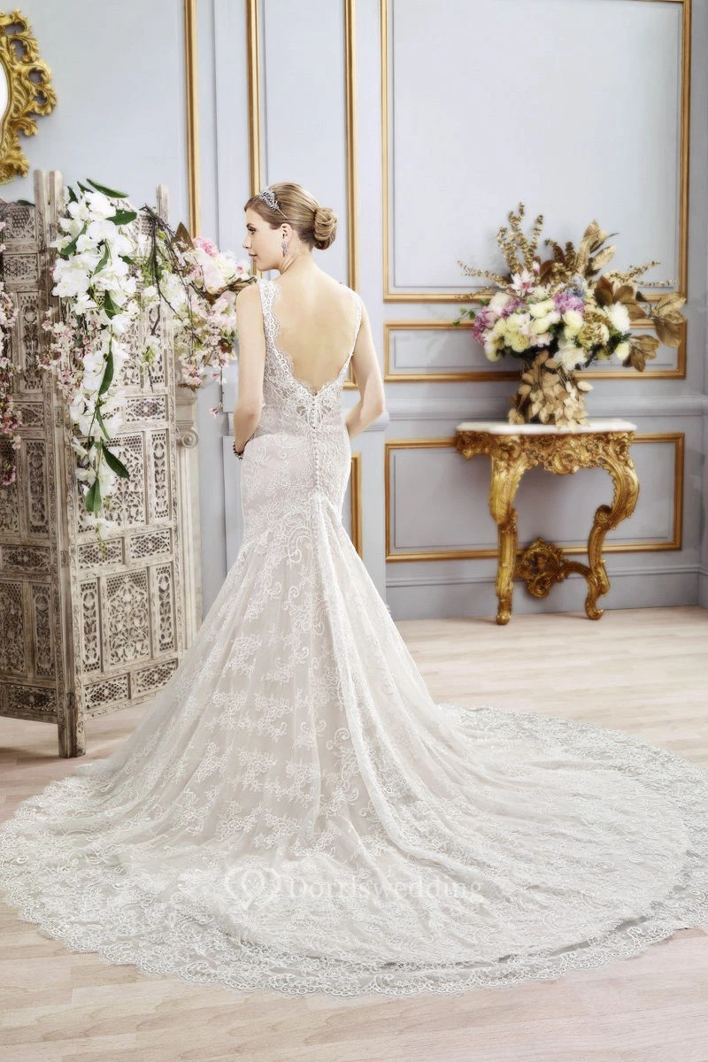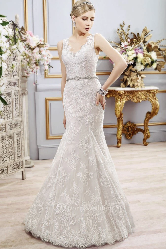 Mermaid Sleeveless V-Neck Floor-Length Appliqued Lace Wedding Dress With Deep-V Back And Waist Jewellery