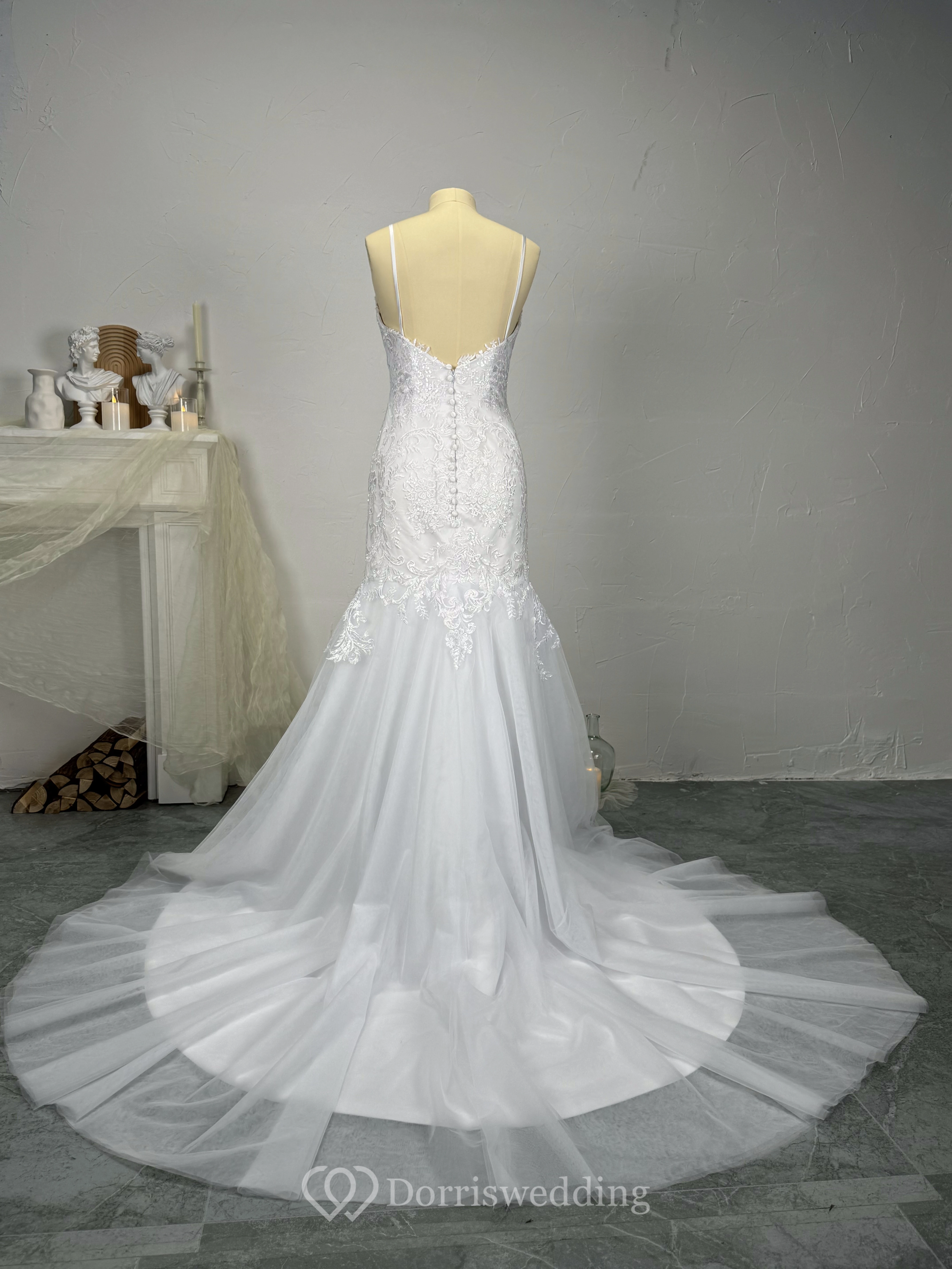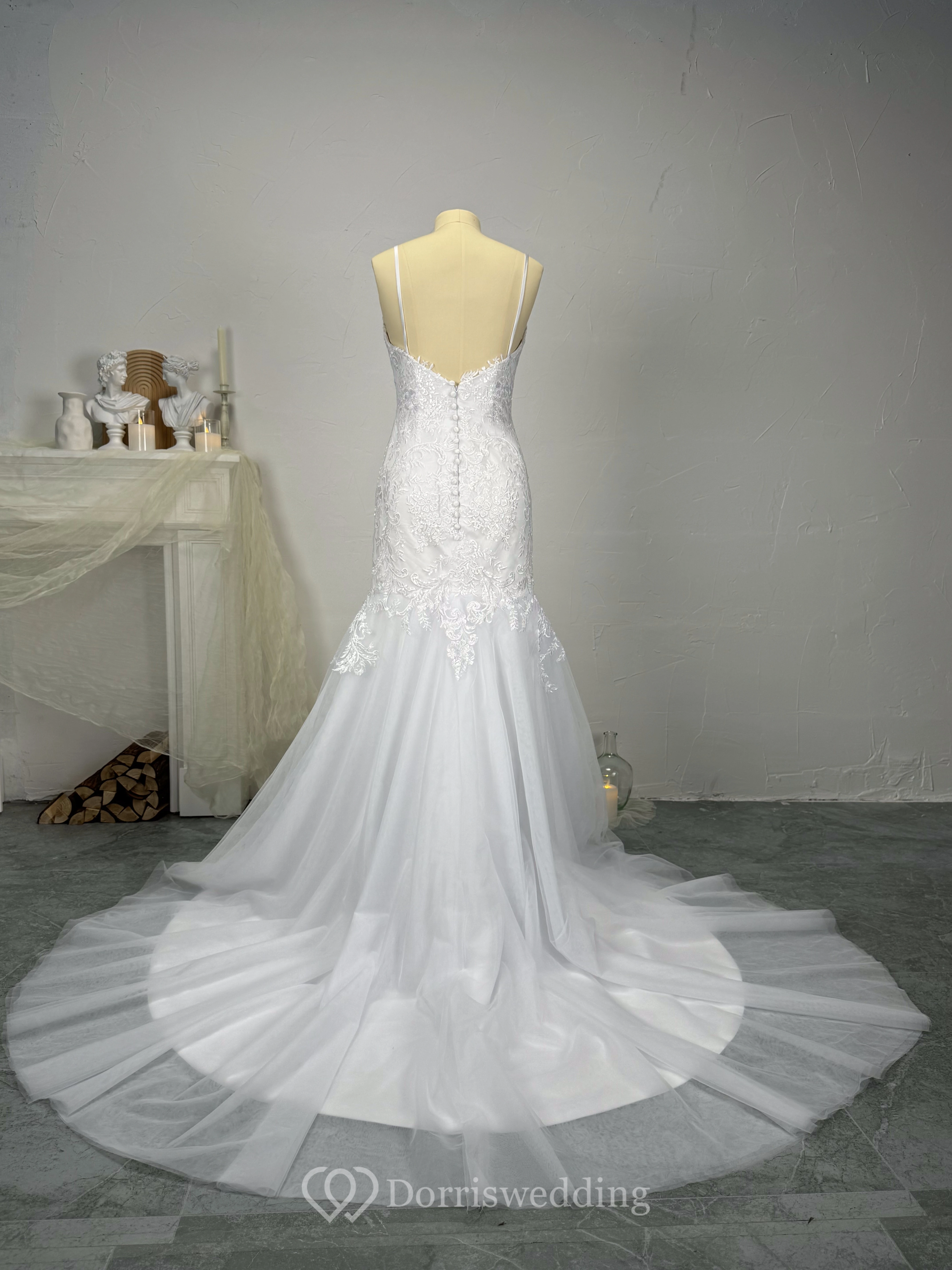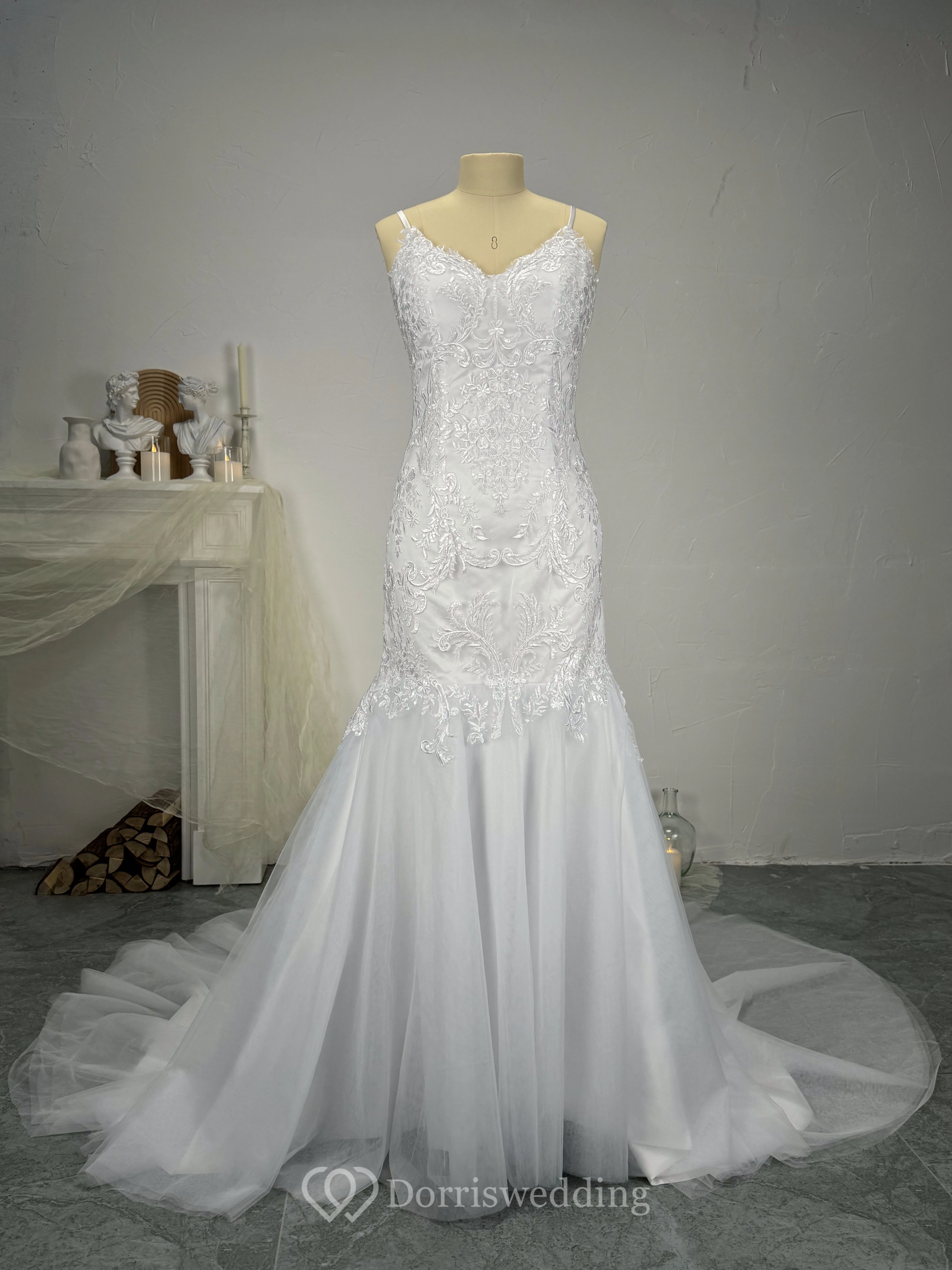 Mermaid Spaghetti Straps Beaded Lace Applique Wedding Dress with Tulle Skirt