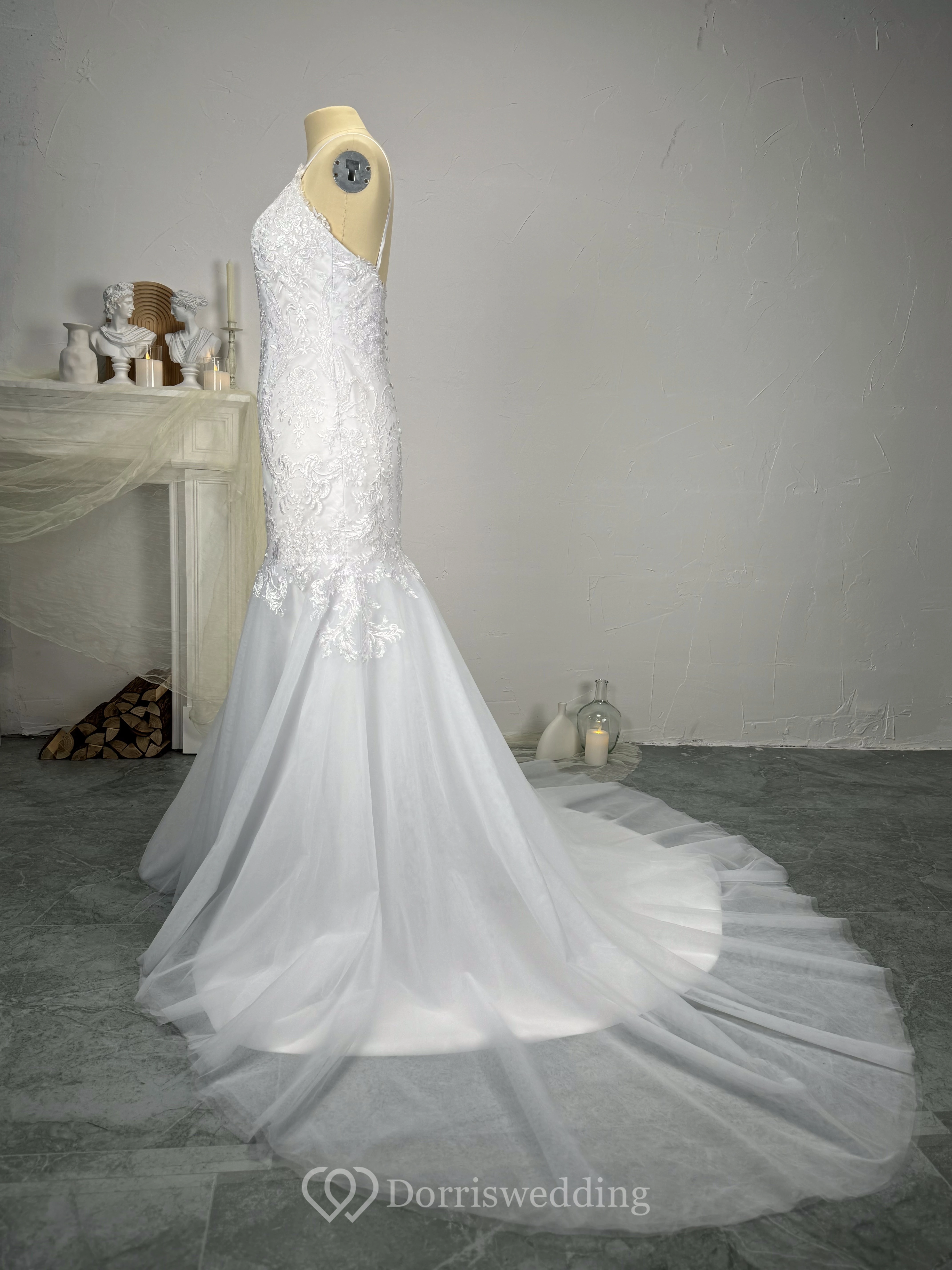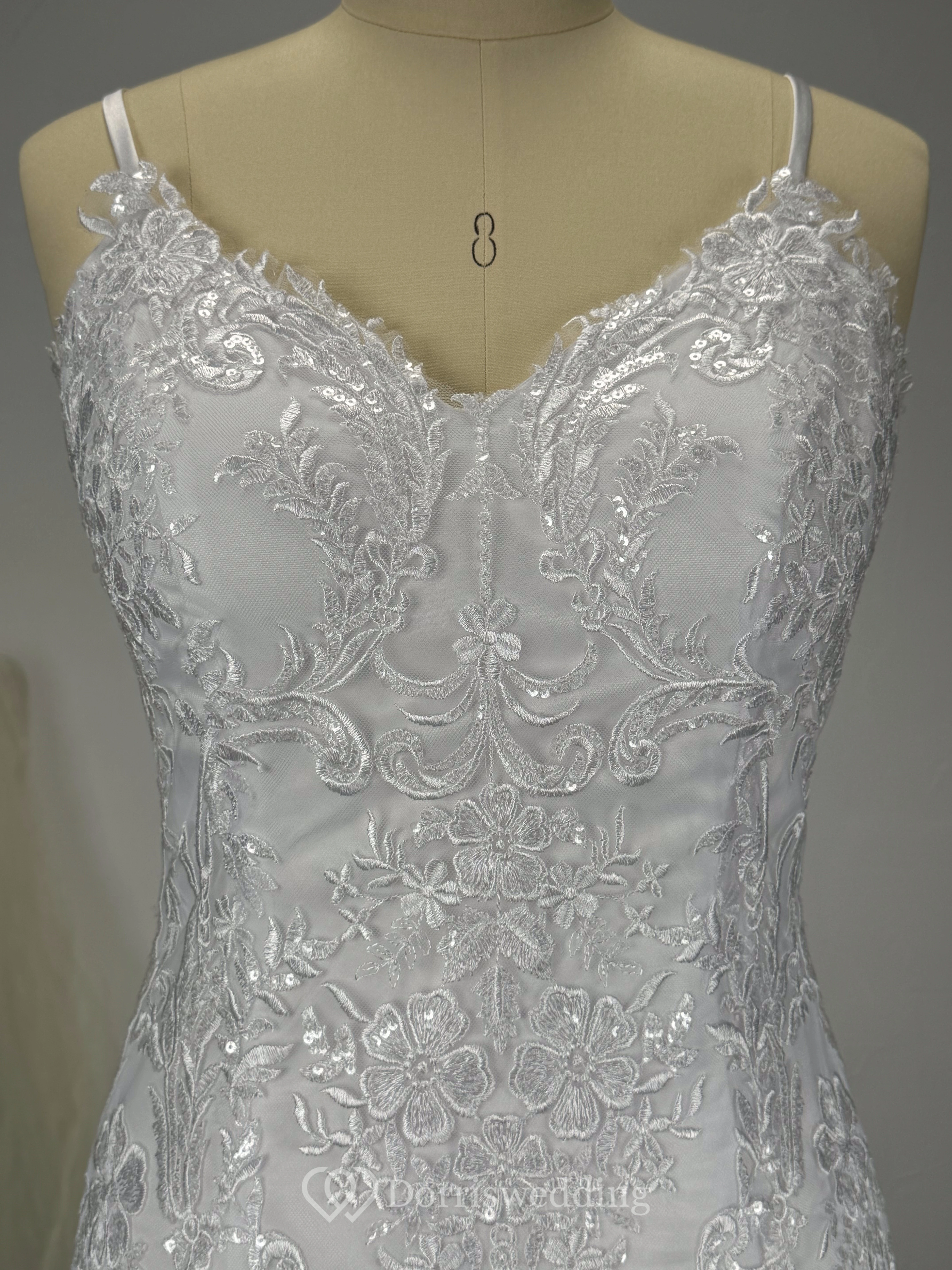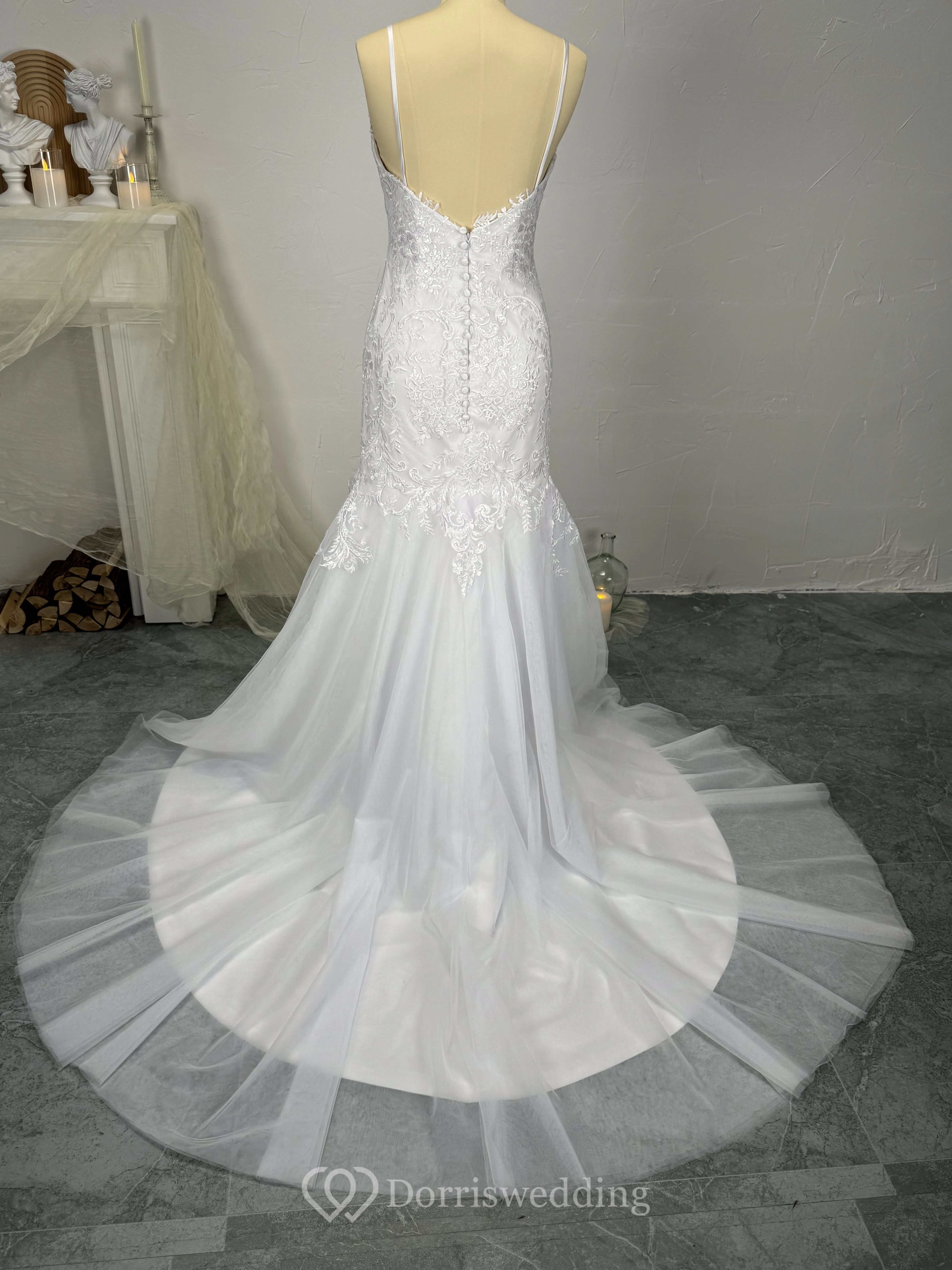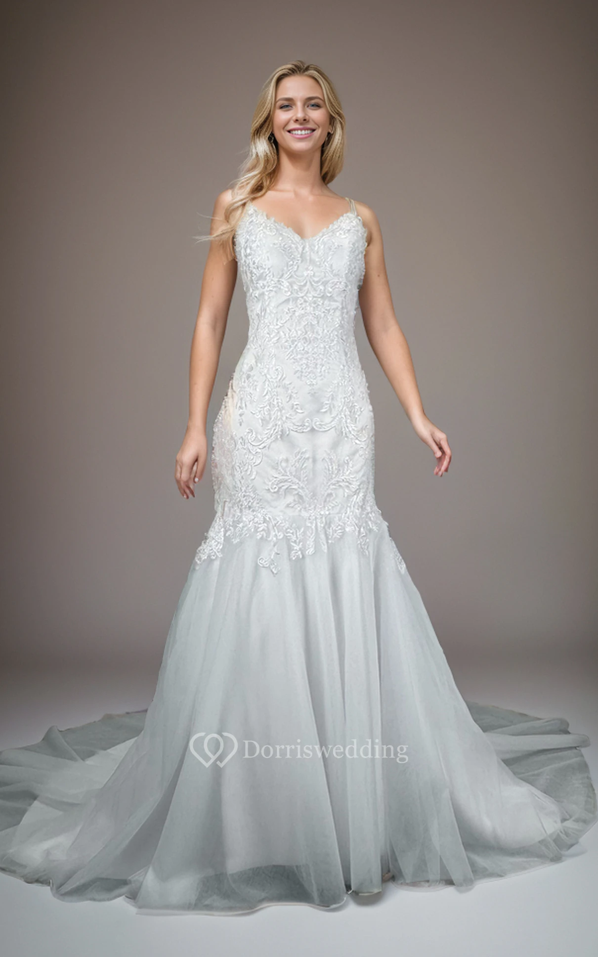 Mermaid Spaghetti Straps Beaded Lace Applique Wedding Dress with Tulle Skirt