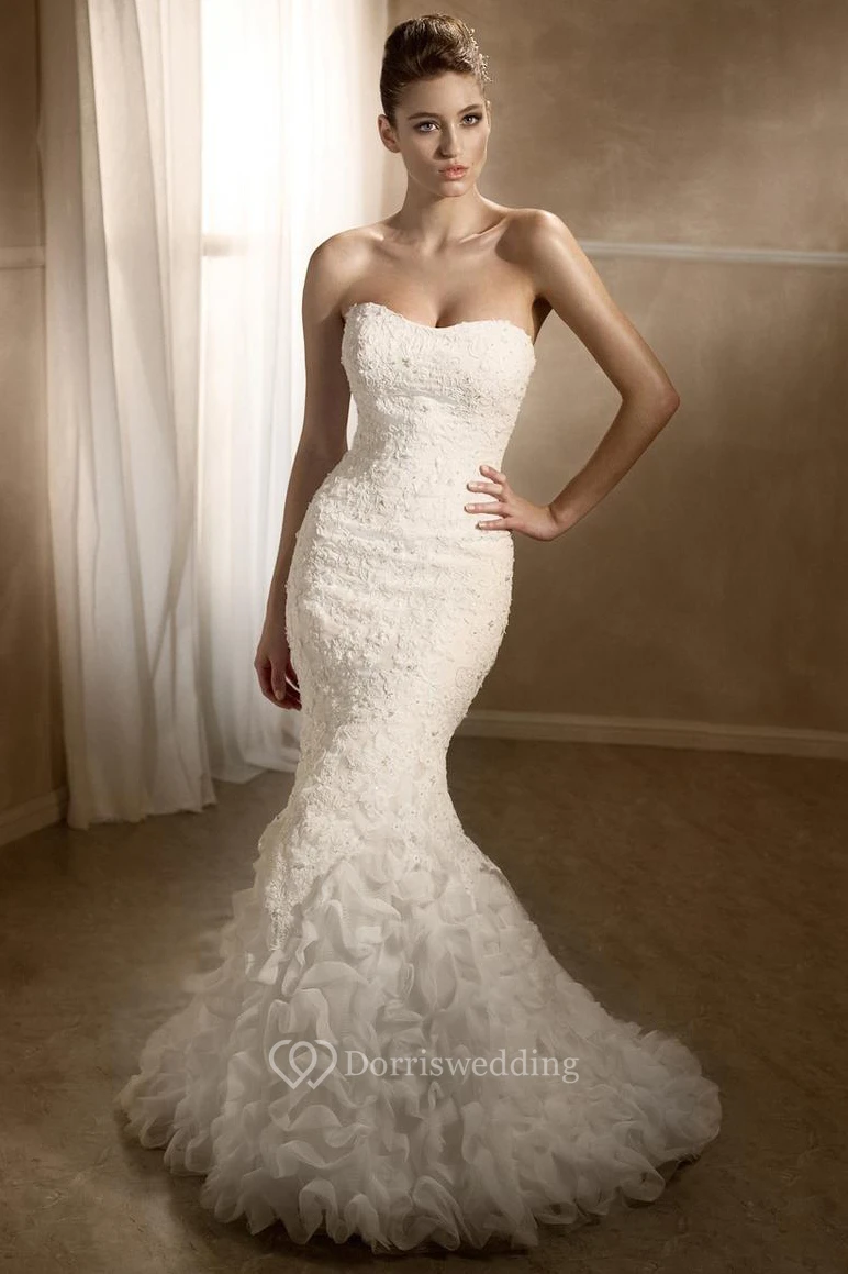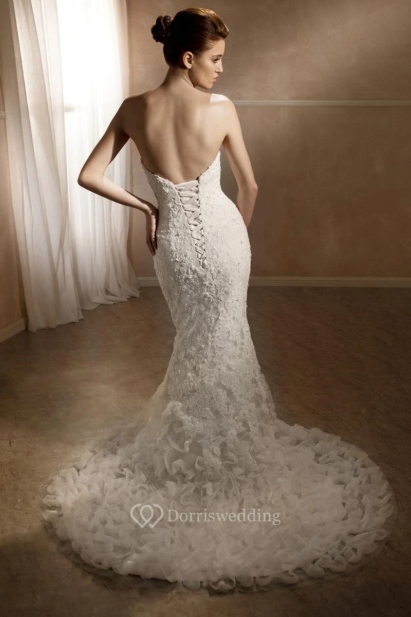 Mermaid Strapless Beaded Lace Wedding Dress With Ruffles And Lace Up