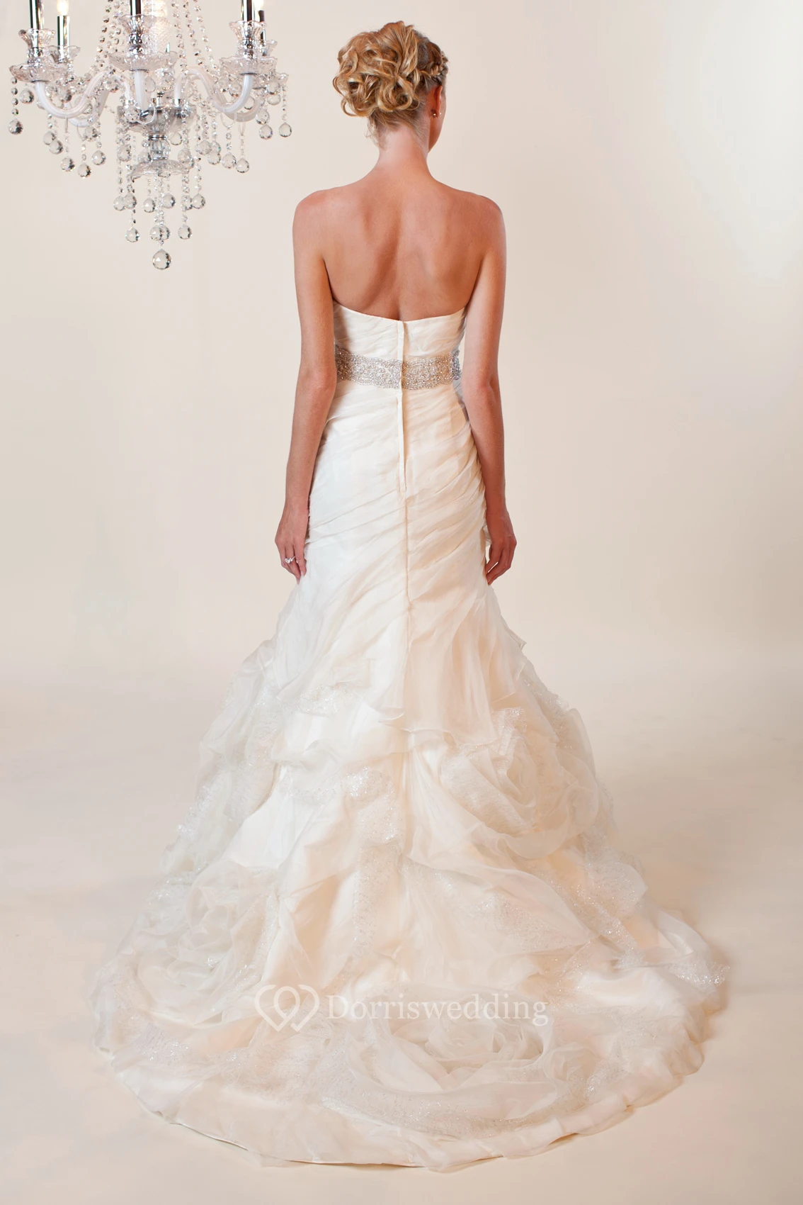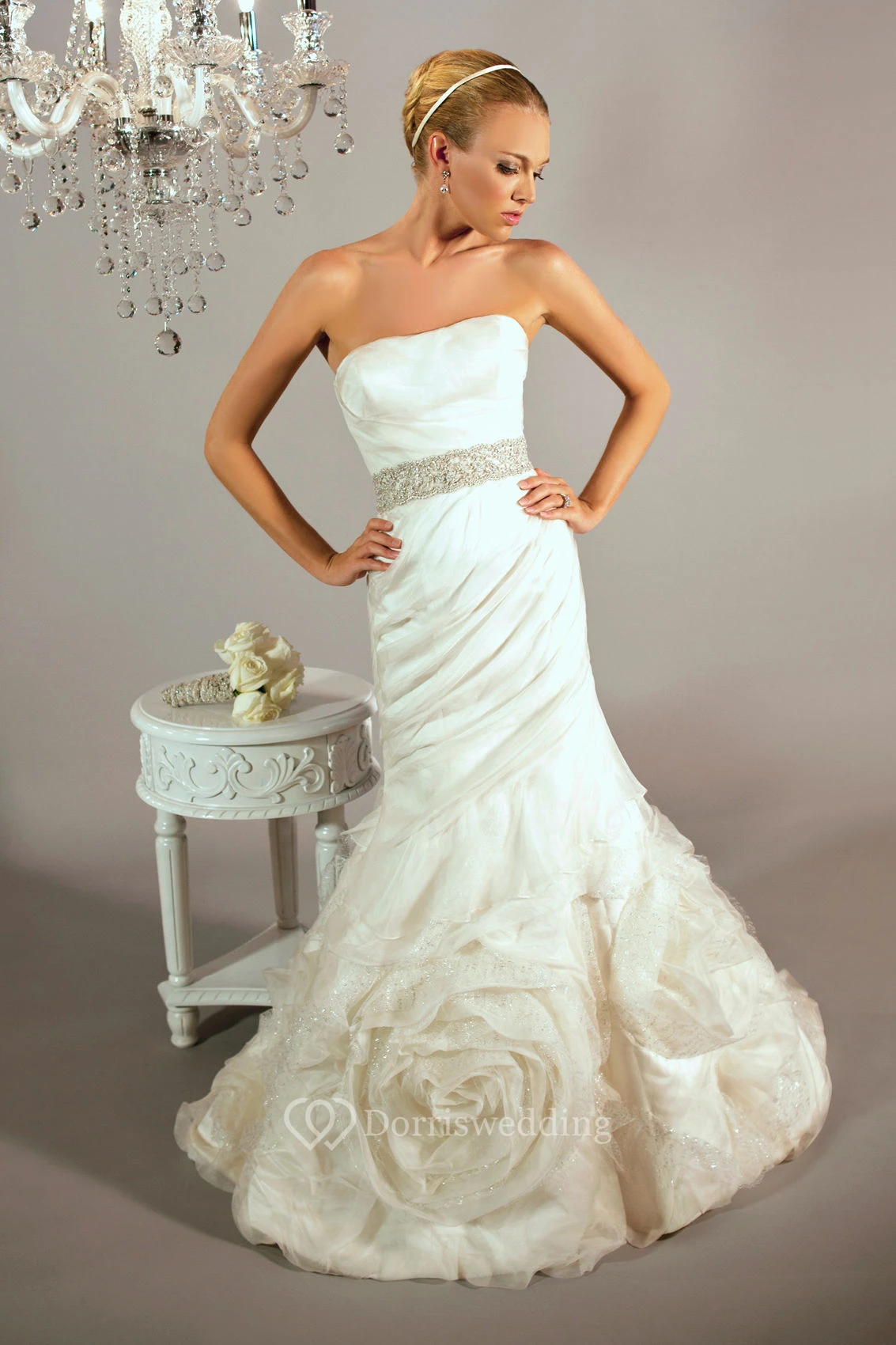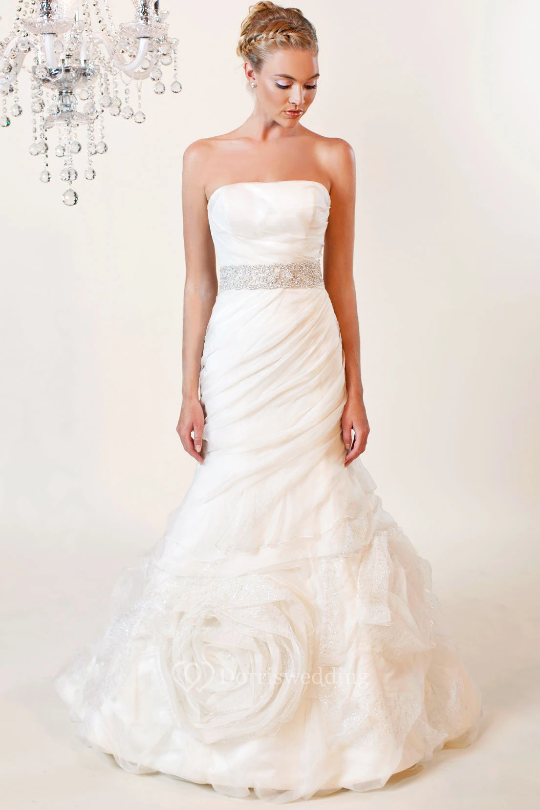 Mermaid Strapless Floor-Length Ruffled Sleeveless Satin Wedding Dress With Waist Jewellery And Flower