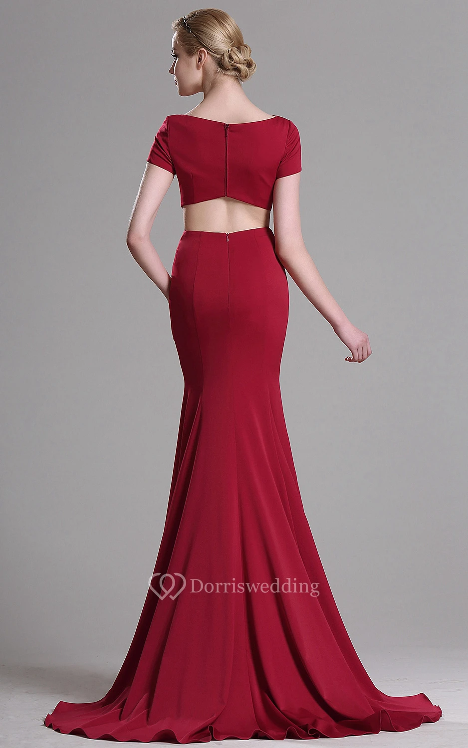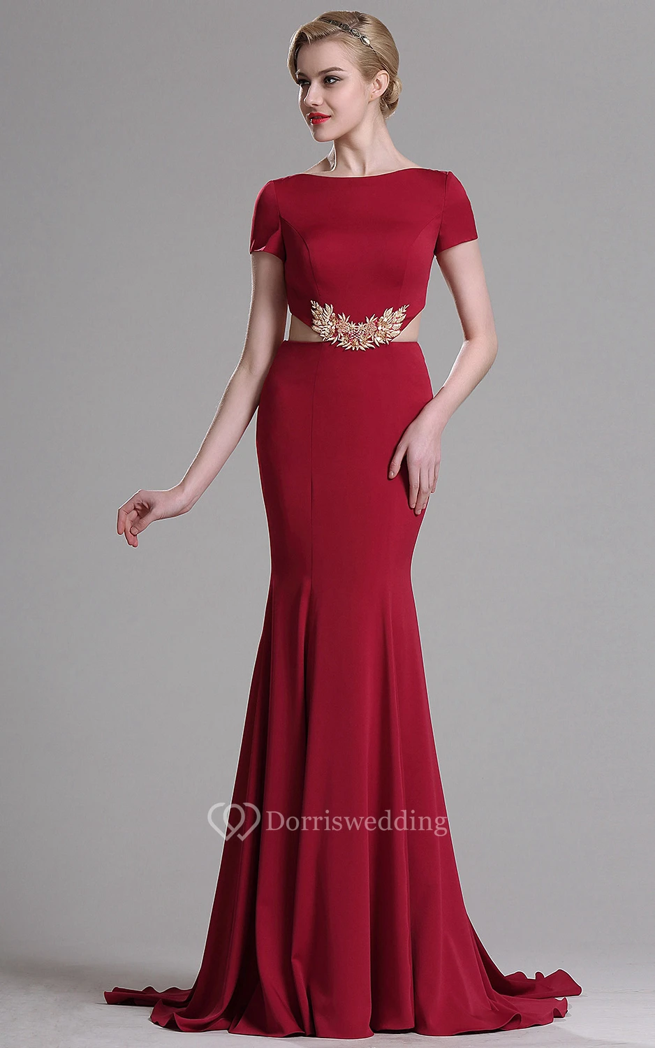 Mermaid Sweep Bateau Short Sleeve Jersey Crystal Detailing Zipper Dress
