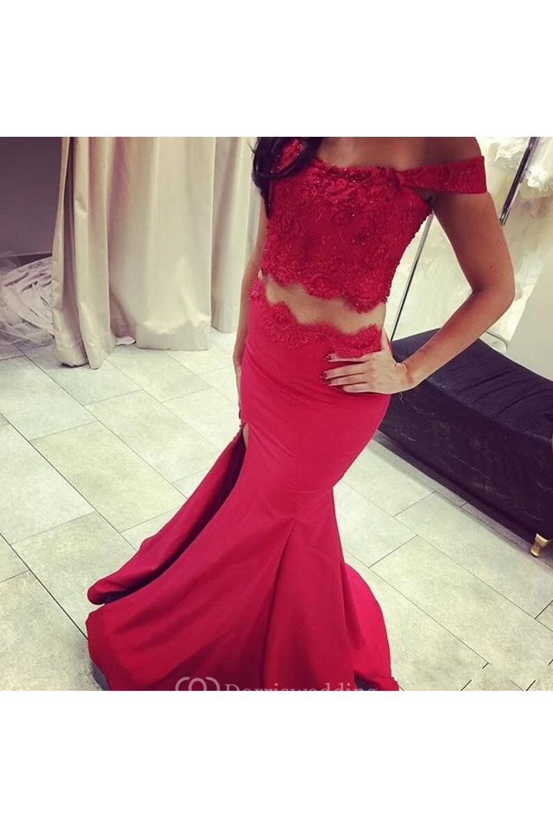 Mermaid Trumpet Satin Lace Off-the-shoulder Short Sleeve Zipper Dress