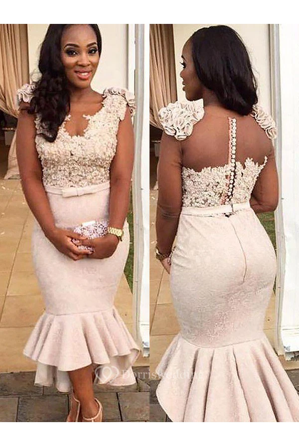 Mermaid Trumpet Satin Lace V-neck Short Sleeve Button Zipper Dress