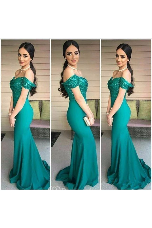Mermaid Trumpet Satin Sequins Off-the-shoulder Short Sleeve Deep-V Back Dress