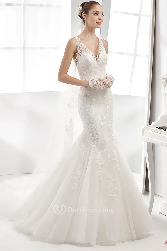Mermaid V-neck Lace Wedding Dress With Appliques And Illusion Back