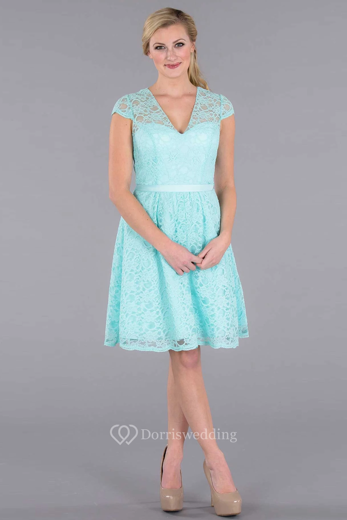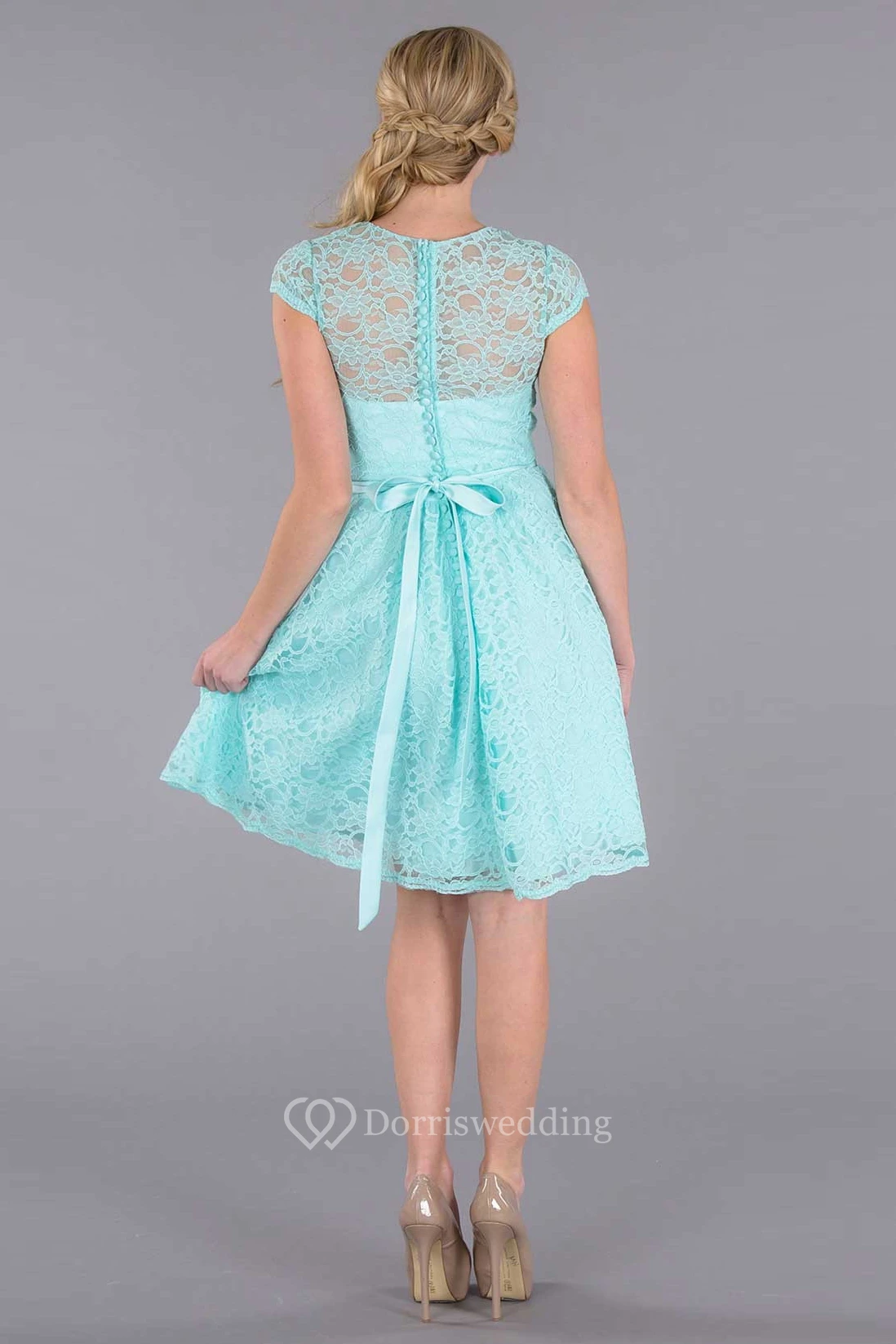 Mini Ribboned V-Neck Cap Sleeve Lace Bridesmaid Dress With Illusion Back