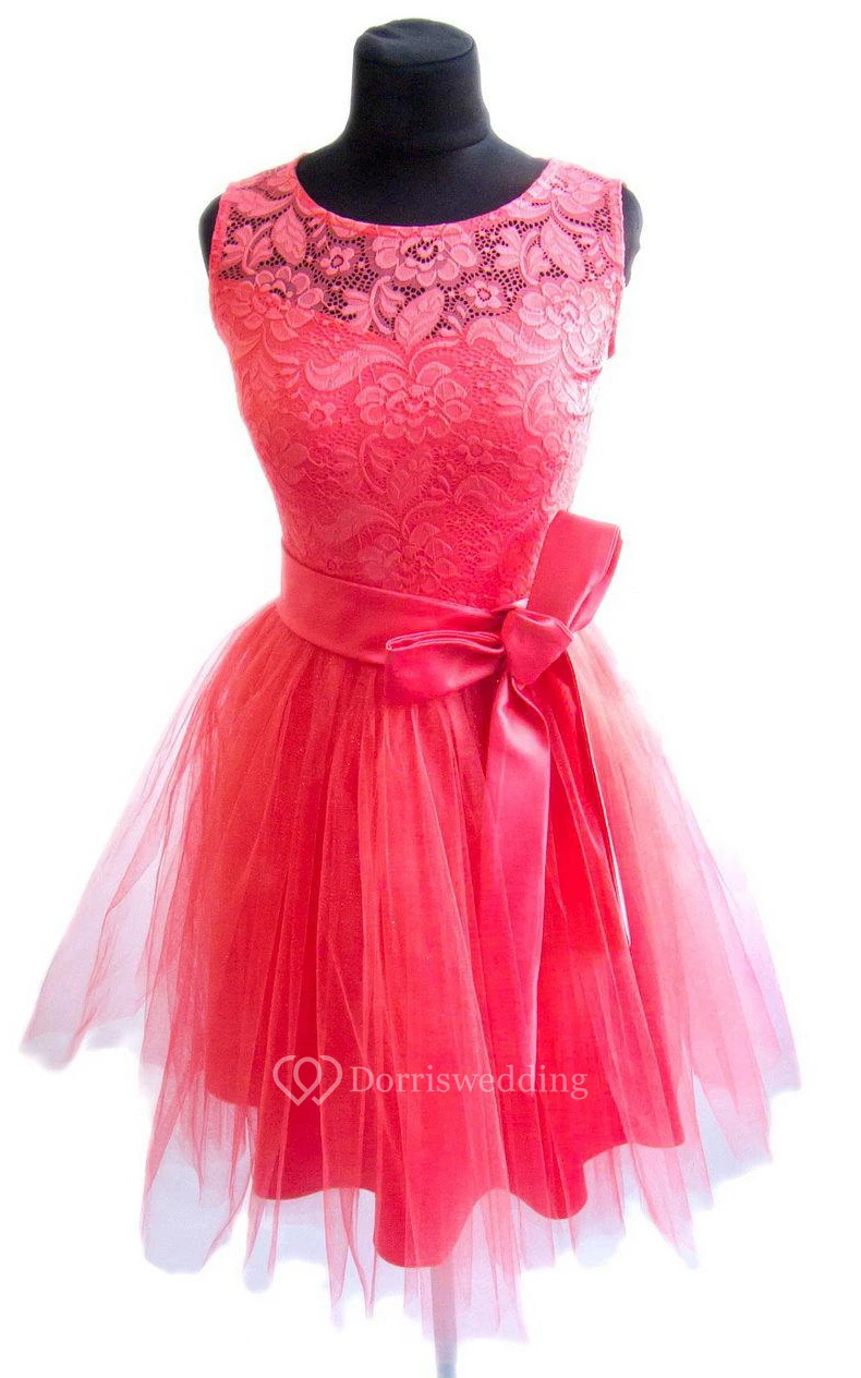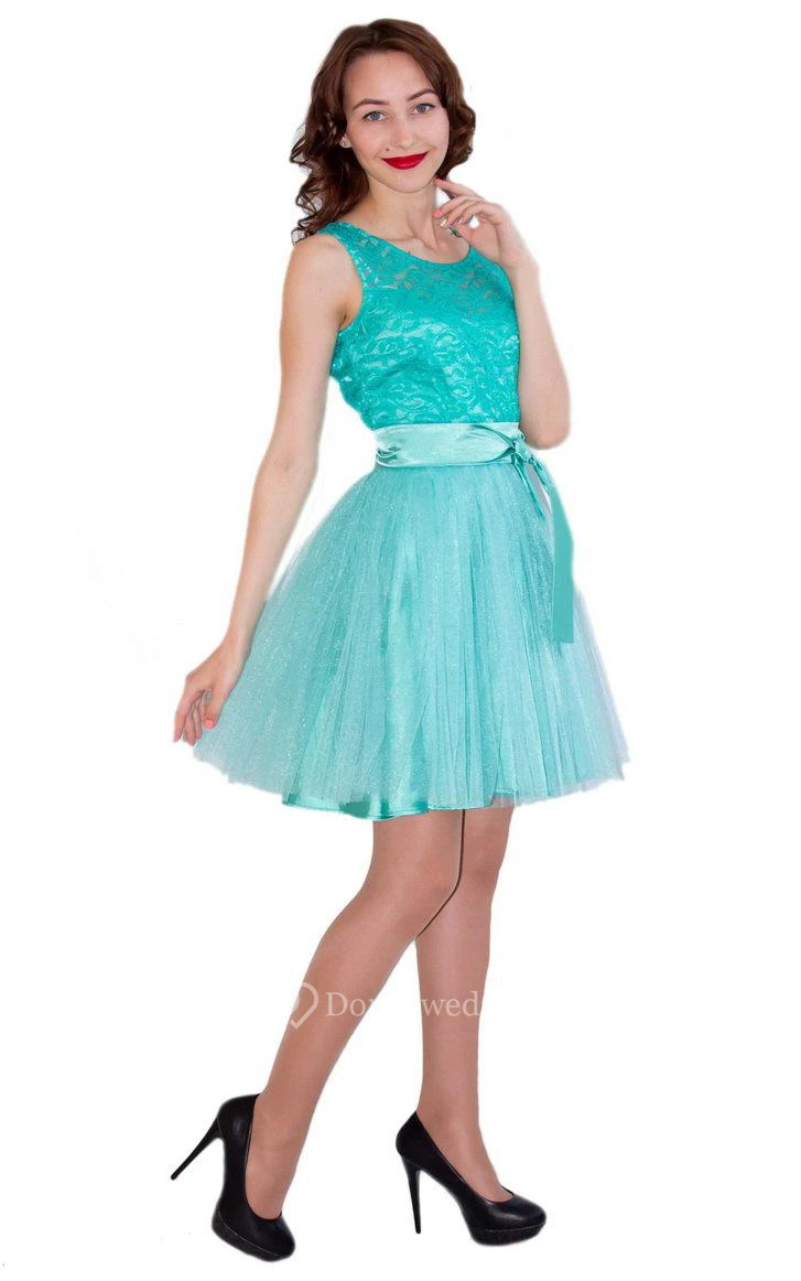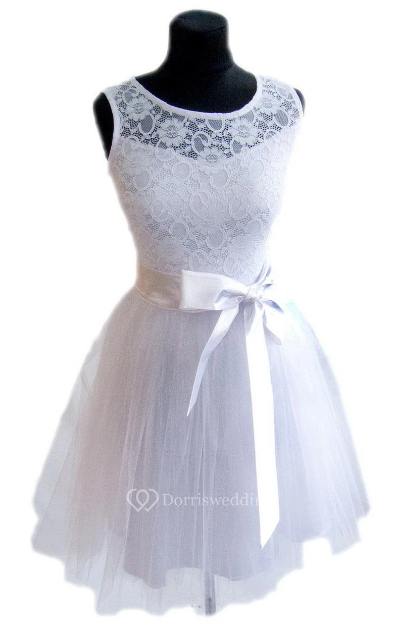 Mini Tulle And Lace Dress With Satin Belt