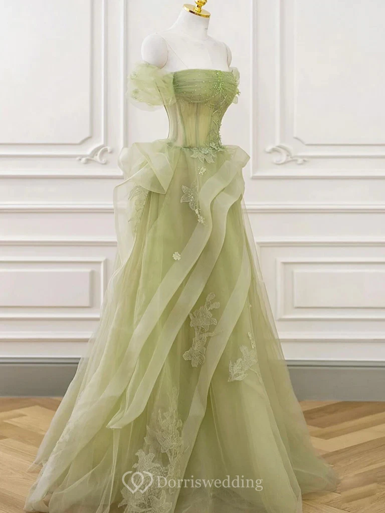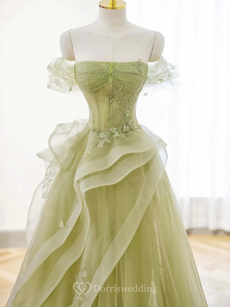 This elegant mint green gown features a strapless design with transparent tulle sleeves and an asymmetrical multi-layer skirt adorned with intricate embroidery and sequin details. The dress combines a fitted bodice with a dynamic, flowing skirt that creates movement and grace. Perfect for formal events, proms, or red-carpet occasions, it offers a blend of sophistication and modern design with its botanical embellishments and luxurious fabric.
