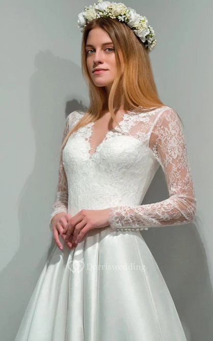 Modern A Line V-neck Floor-length Long Sleeve Satin Wedding Dress with Appliques