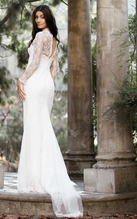 Modern High Neck Lace Mermaid Long Sleeve Floor-length Sweep Train Wedding Dress