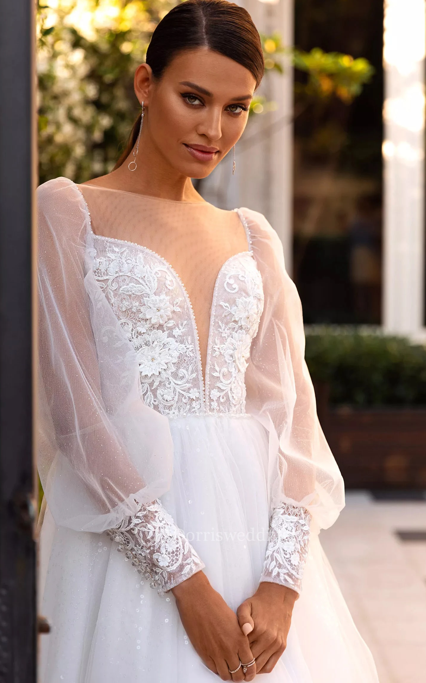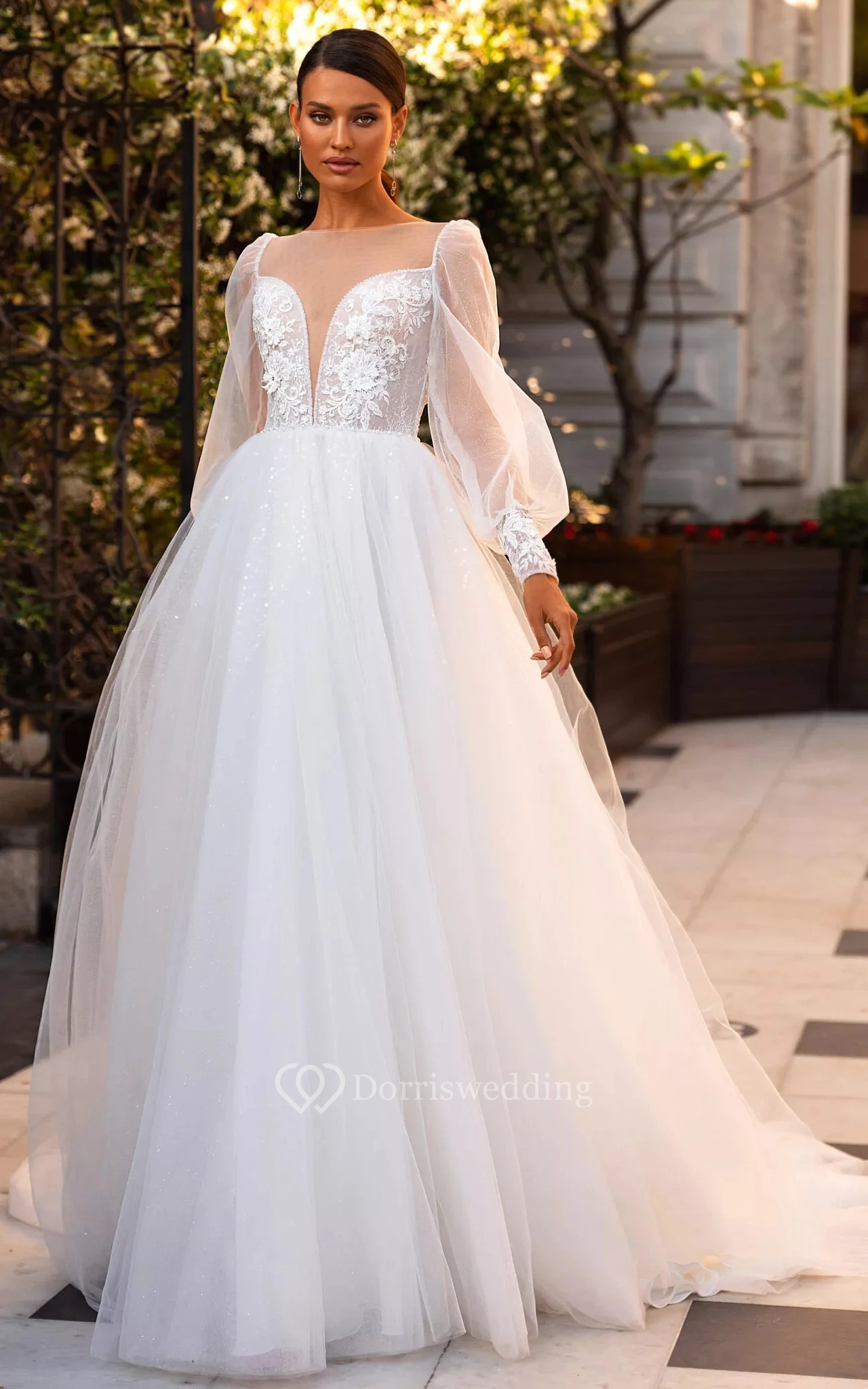 Modern Lace Floor-length Long Sleeve Ball Gown Illusion Wedding Dress with Sequins