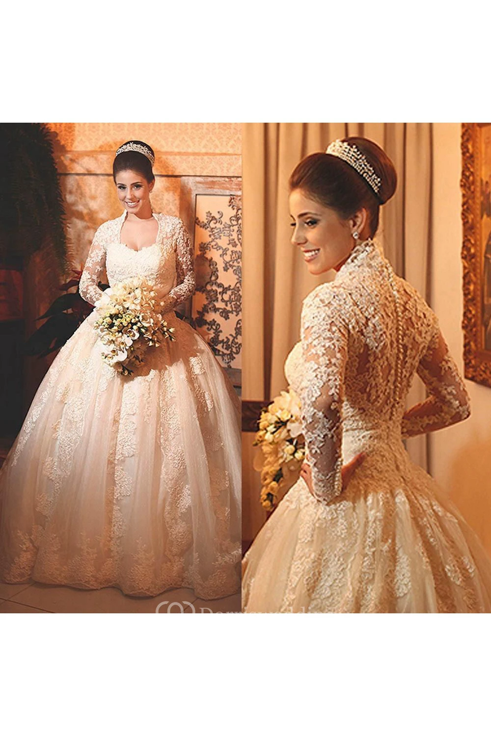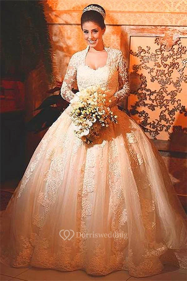 Modern Lace Long Sleeve Princess Wedding Dress Ball Gown Button Zipper Back