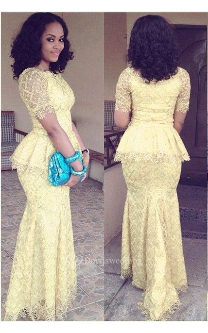 Modern Lace Mermaid Yellow Prom Dress Short Sleeve