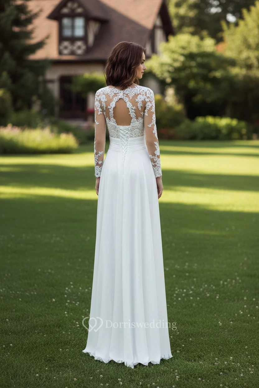 I was looking for a dress that felt modern but still very "bridal," and this was it. The long lace sleeves are so sophisticated, and the high side slit adds just the right amount of sexiness. The chiffon skirt is light and airy, which was perfect for our spring wedding. I received endless compliments on the unique design. It’s a high-quality dress that fits perfectly.