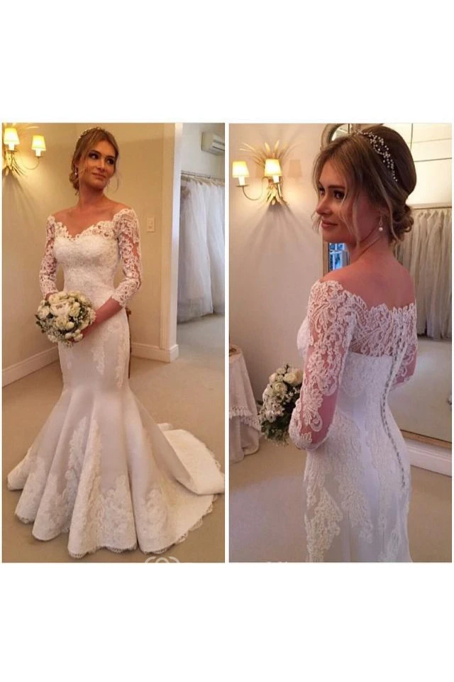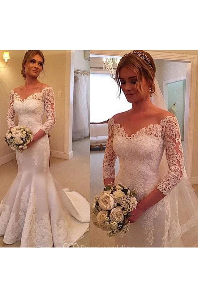 Modern Off-the-shoulder 3-4-longth-sleeve Mermaid Wedding Dress With Lace Appliques