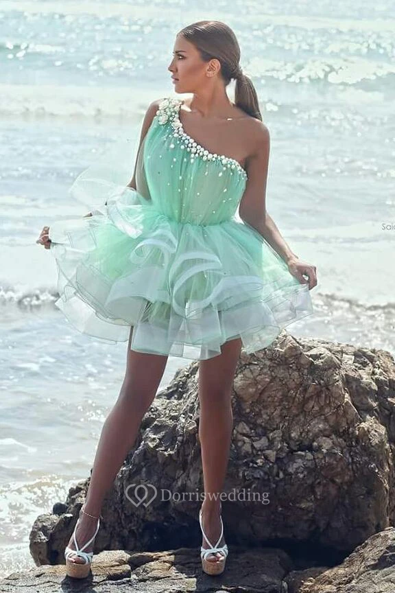 Modern One-shoulder Short Homecoming Dress With Beadings Ruffles
