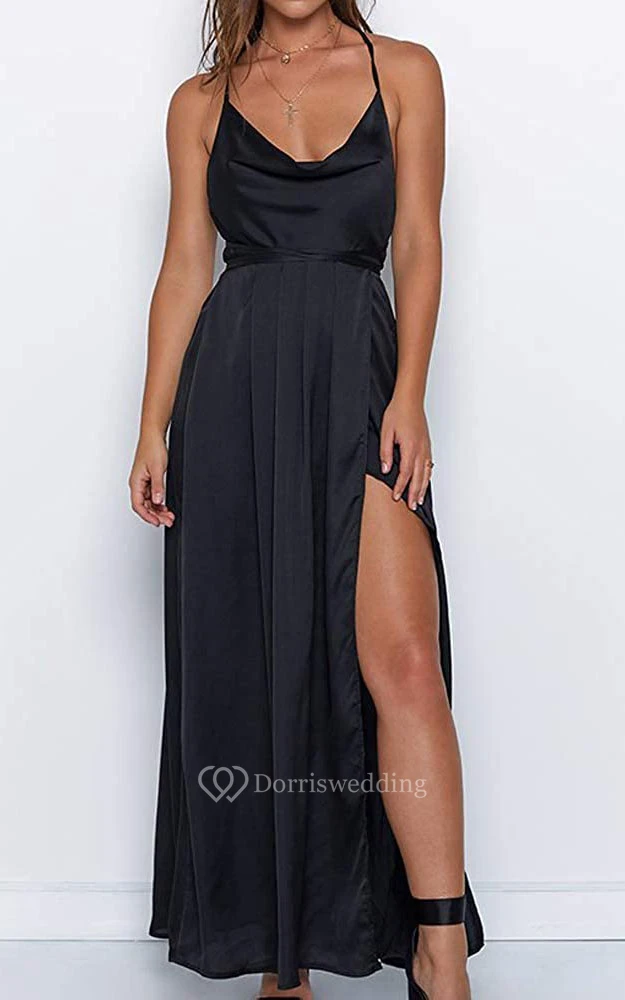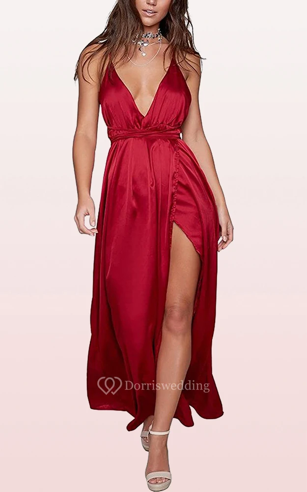 Modern Satin V-neck Cowel A Line Guest Dress With Ruffles and Split Front