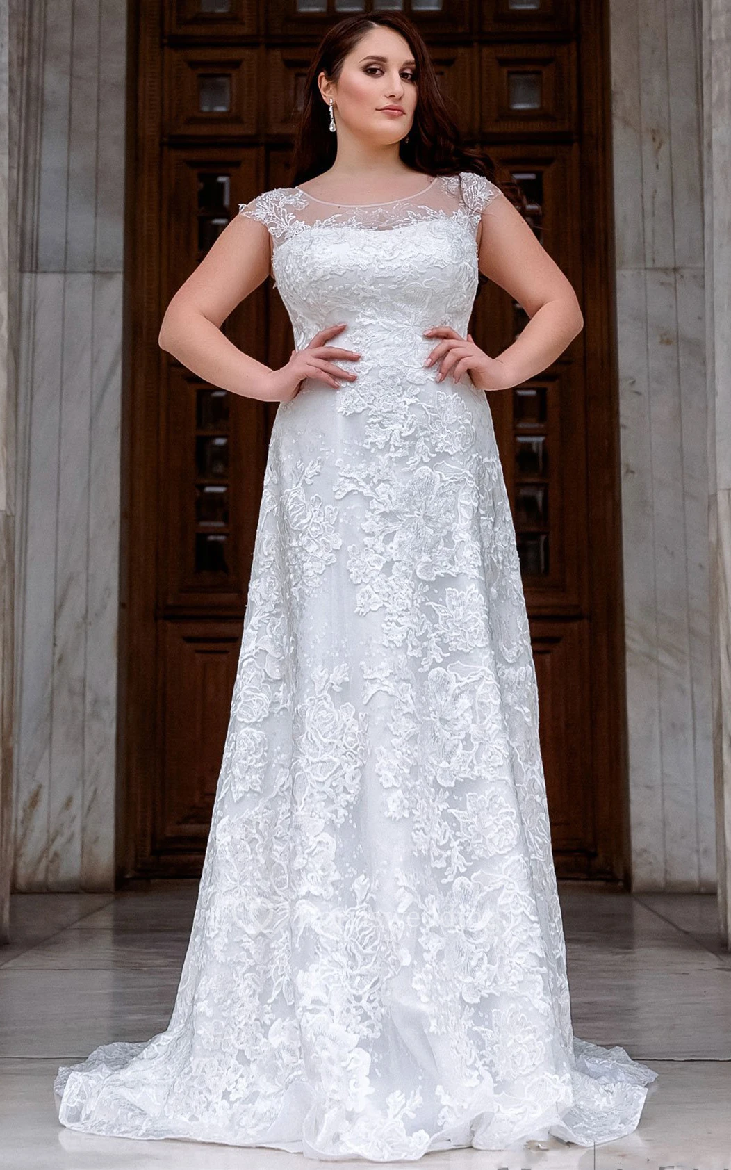 Modern Short Sleeve Court Train Lace A Line Wedding Dress with Appliques