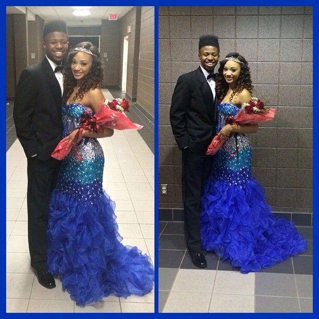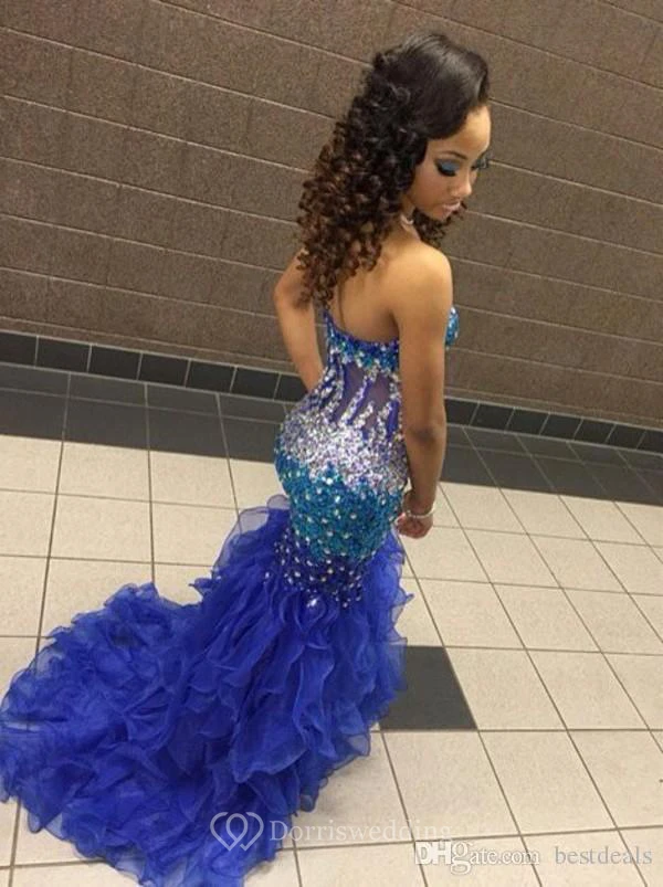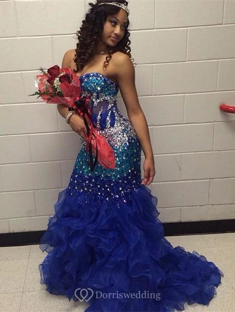 Modern Strapless Royal Blue Prom Dresses Crystal Organza Mermaid Party Gowns