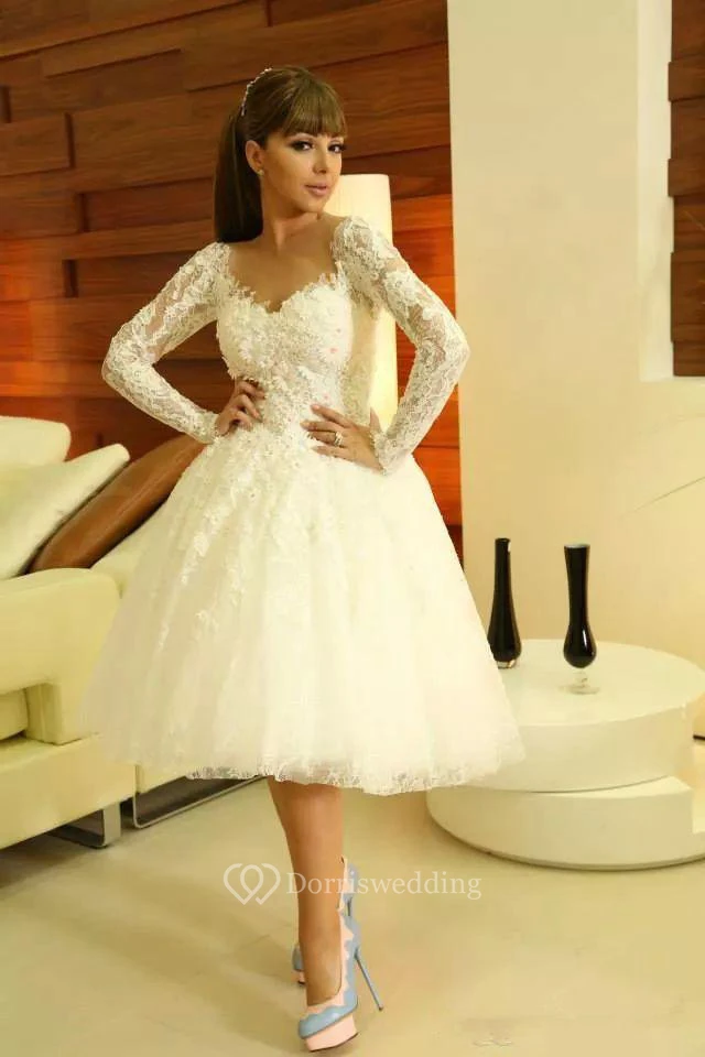 Modern Sweetheart Long Sleeve Short Tea Length Wedding Dress With Lace Appliques