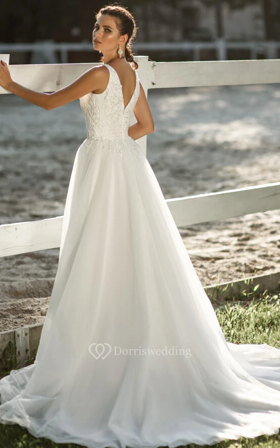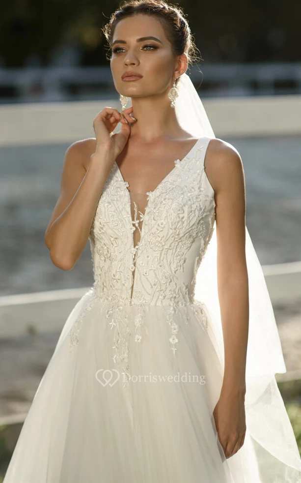 Modern Tulle Plunging Neckline Sleeveless Appliques Wedding Dress With Zipper