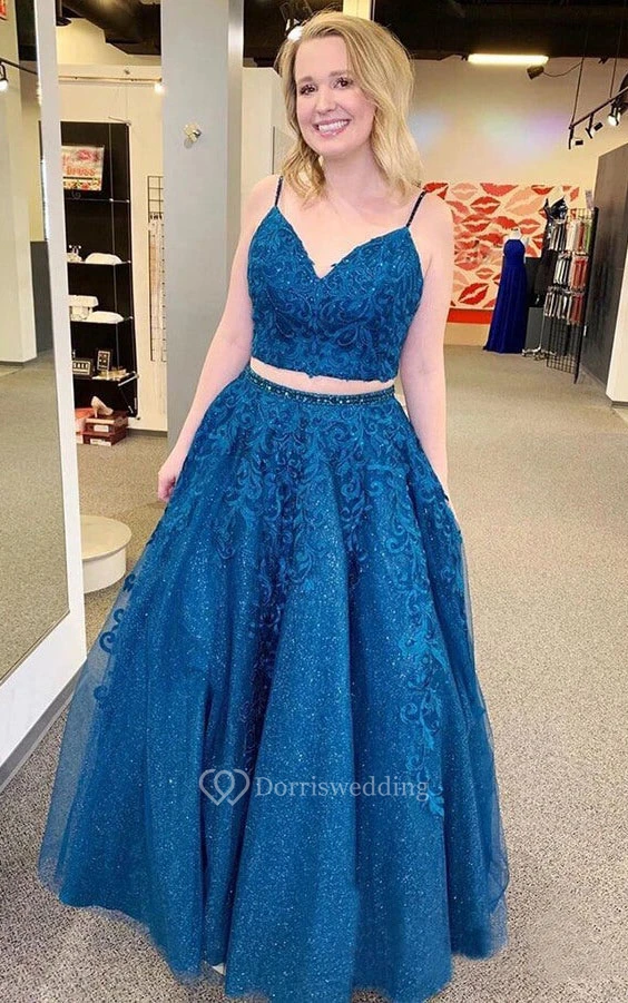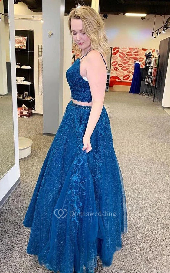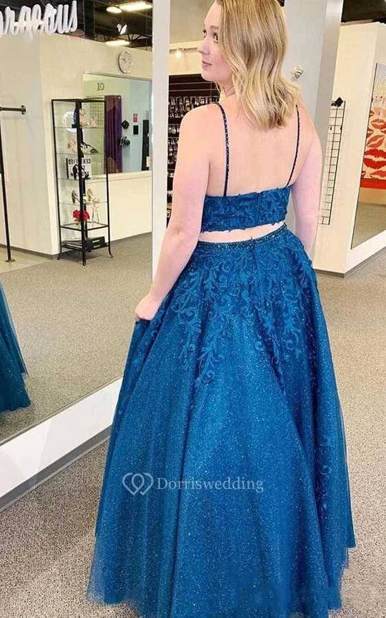 Modern Two Piece Lace Spaghetti Floor-length Backless Evening Dress with Appliques