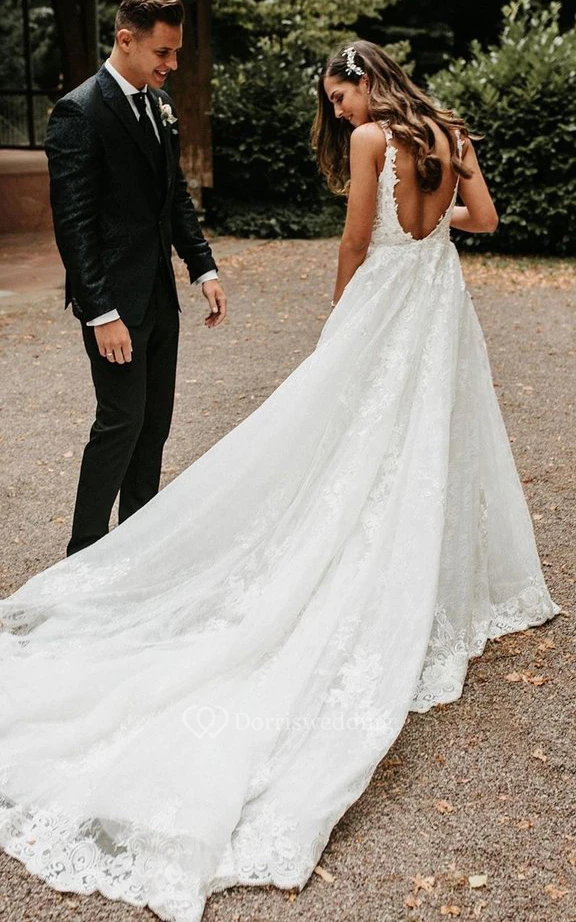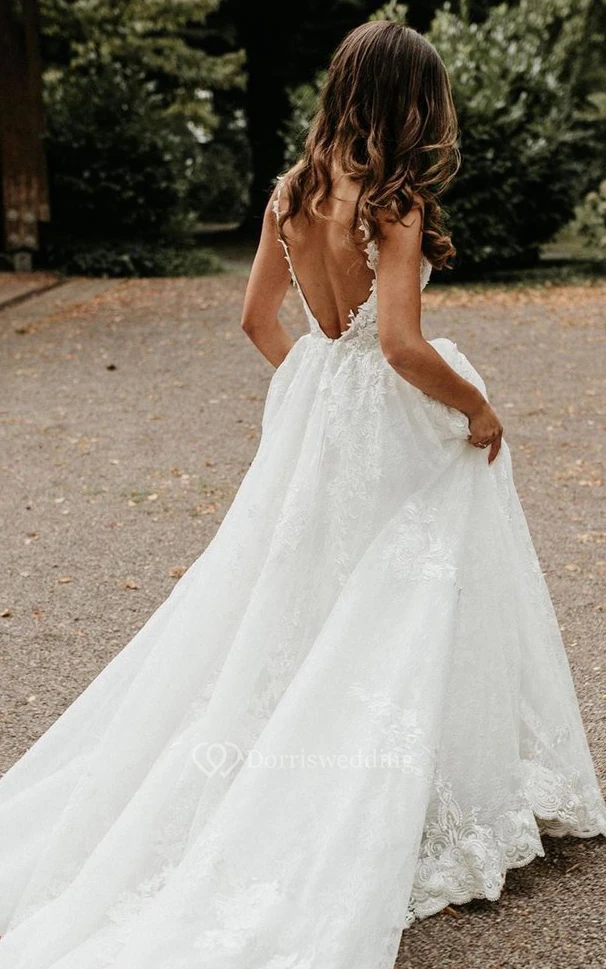 Modern V-neck Lace A Line Floor-length Court Train Sleeveless Beach Wedding Dress with Appliques