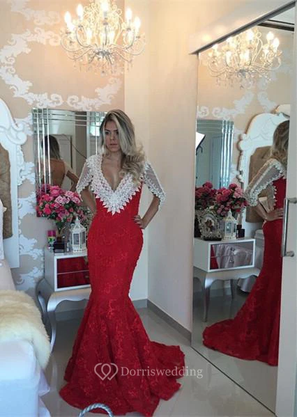 Modern V-neck Lace Mermaid Prom Dress Half Sleeve Zipper