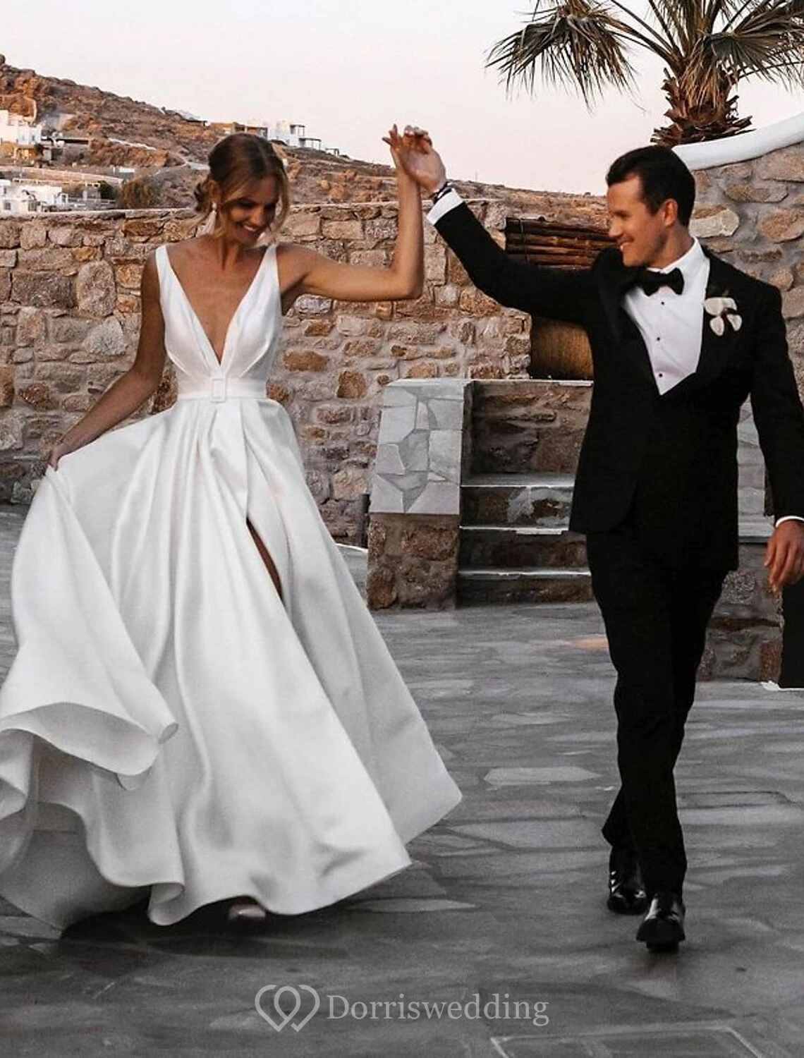 Modern V-Neck Satin A-Line Wedding Dress with Thigh-High Slit