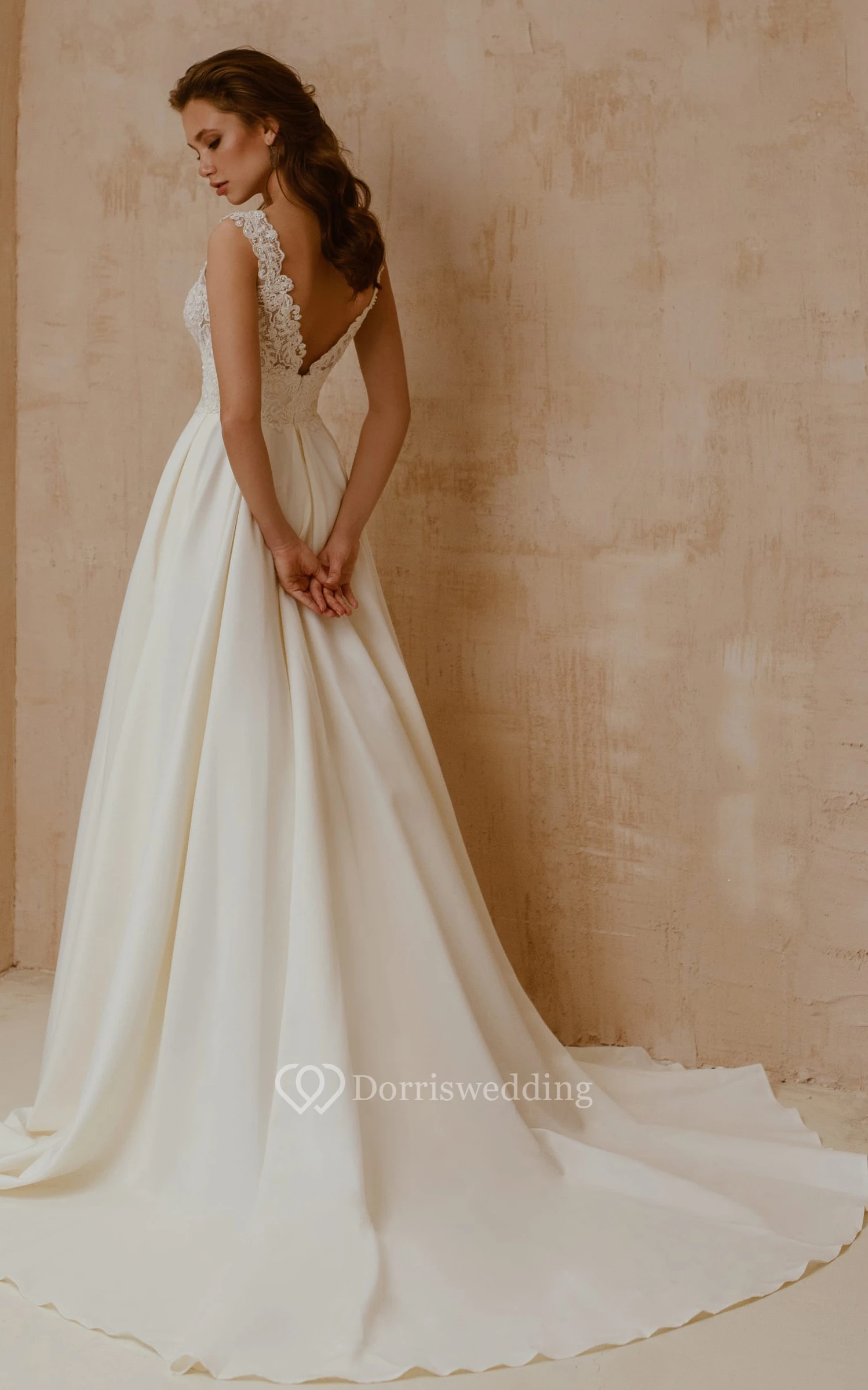 Modern V-neck Satin Lace A Line Short Sleeve Floor-length Sweep Train Simple Wedding Dress with Pleats