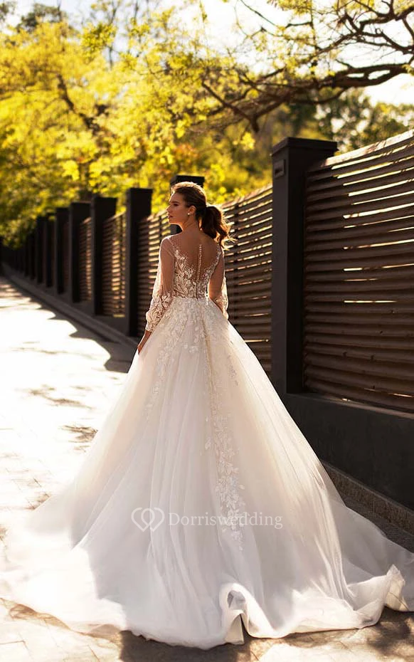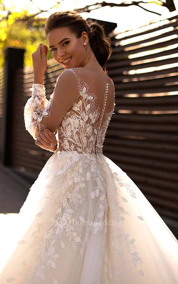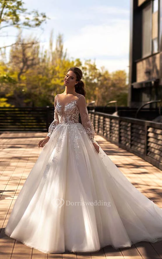 Modest Illusion Long Sleeve Ball Gown Applique Elegant Wedding Dress with Beadings
