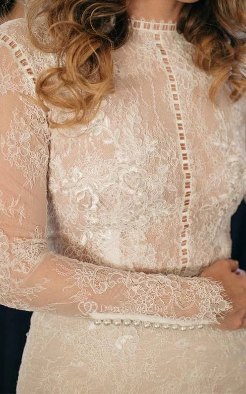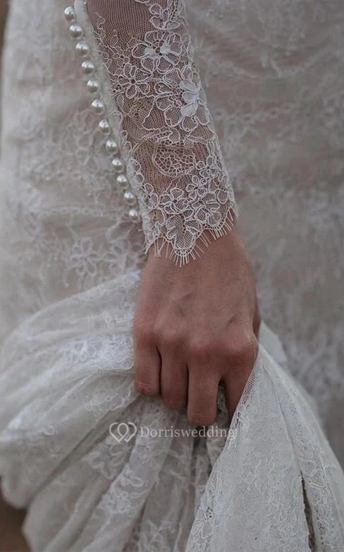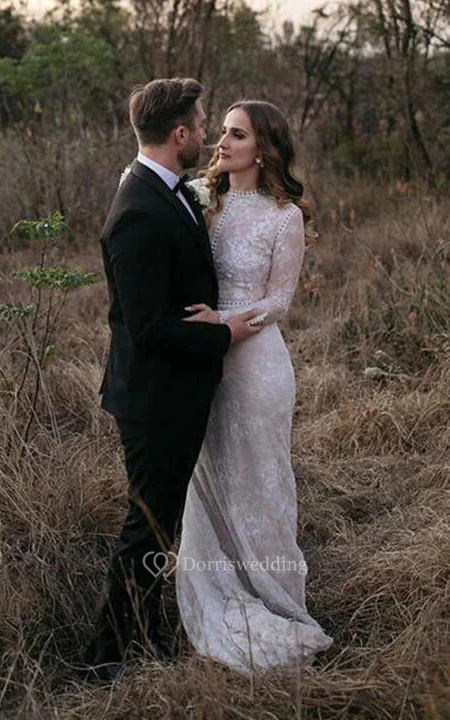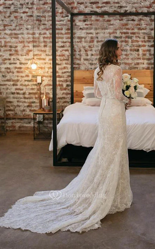 Modest Jewel-neck Sheath Long Sleeve Wedding Dress with Court Train