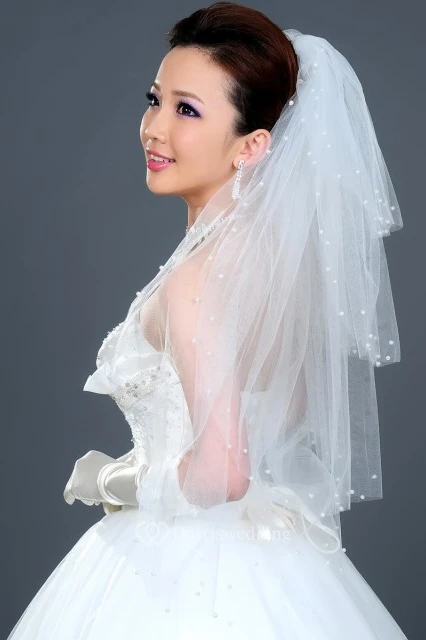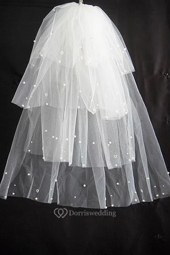 Multi-Layered Puffy Elbow Wedding Veil with Pearl Beading