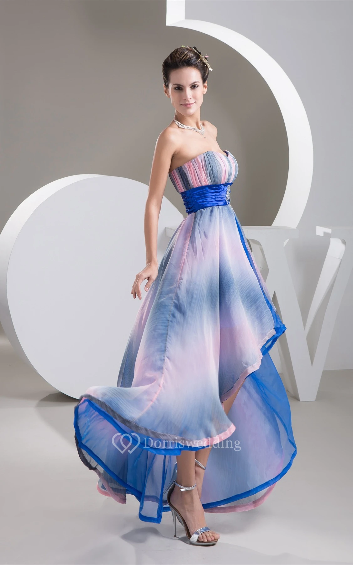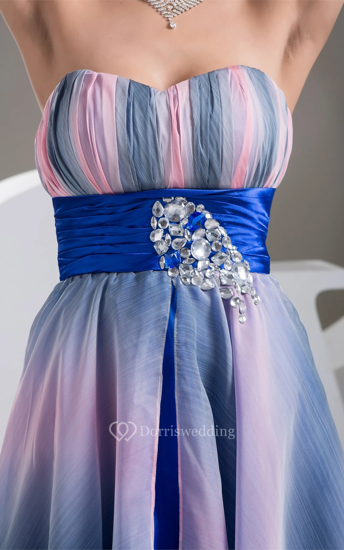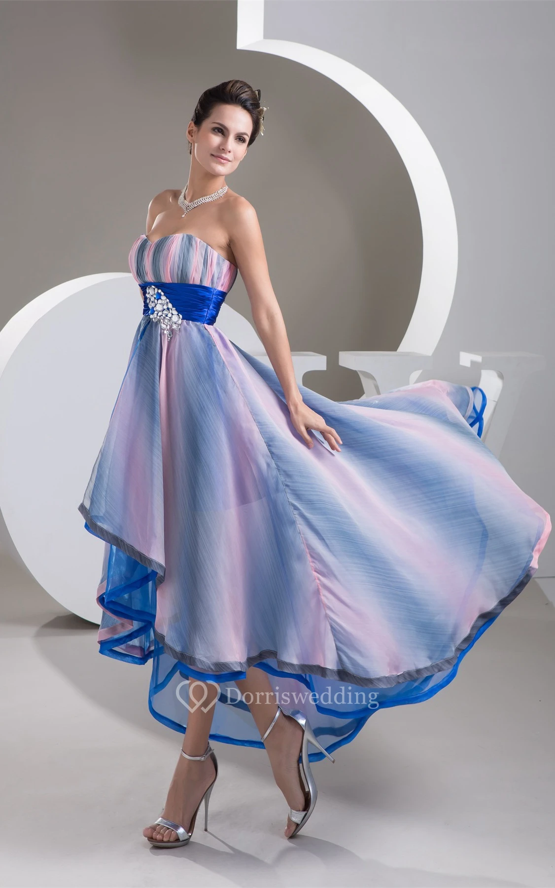 Mute-Color Ruched High-Low Rhinestone and Dress With Pleats
